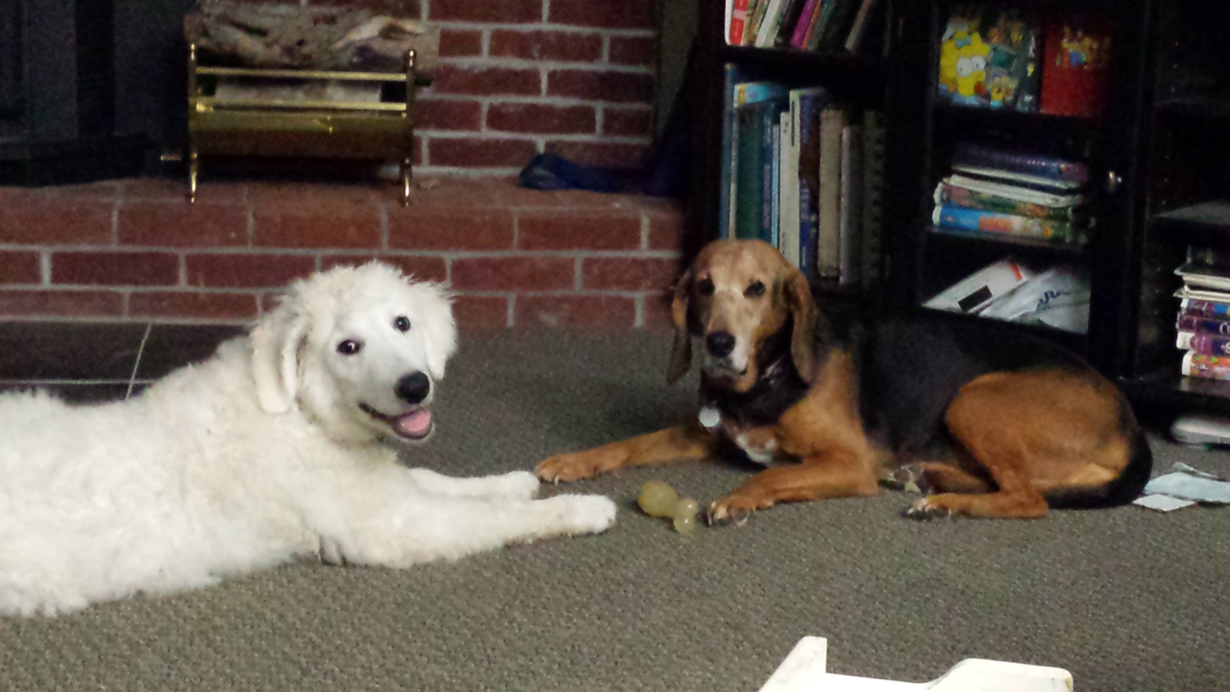 Sokka is 72 pounds now and working days(8-4) with the birds and the horses. Carley the hound dog is happy he has a job now that he is 5 months old and towering over her. :)