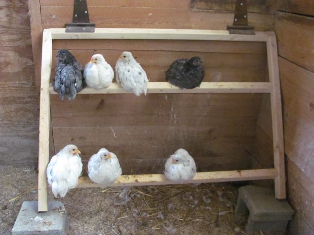 The roosts have bins under them when there are adult birds in the pen, taken out so the chicks wouldn't fall in to them.