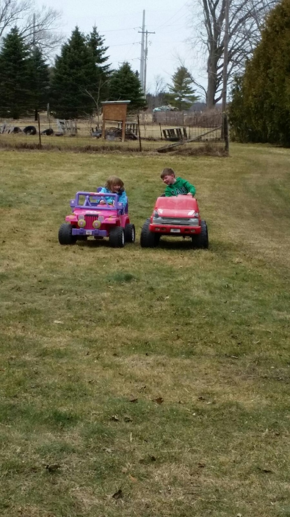 Great day to be outside watchin the grandkids in their "trucks " lol luck