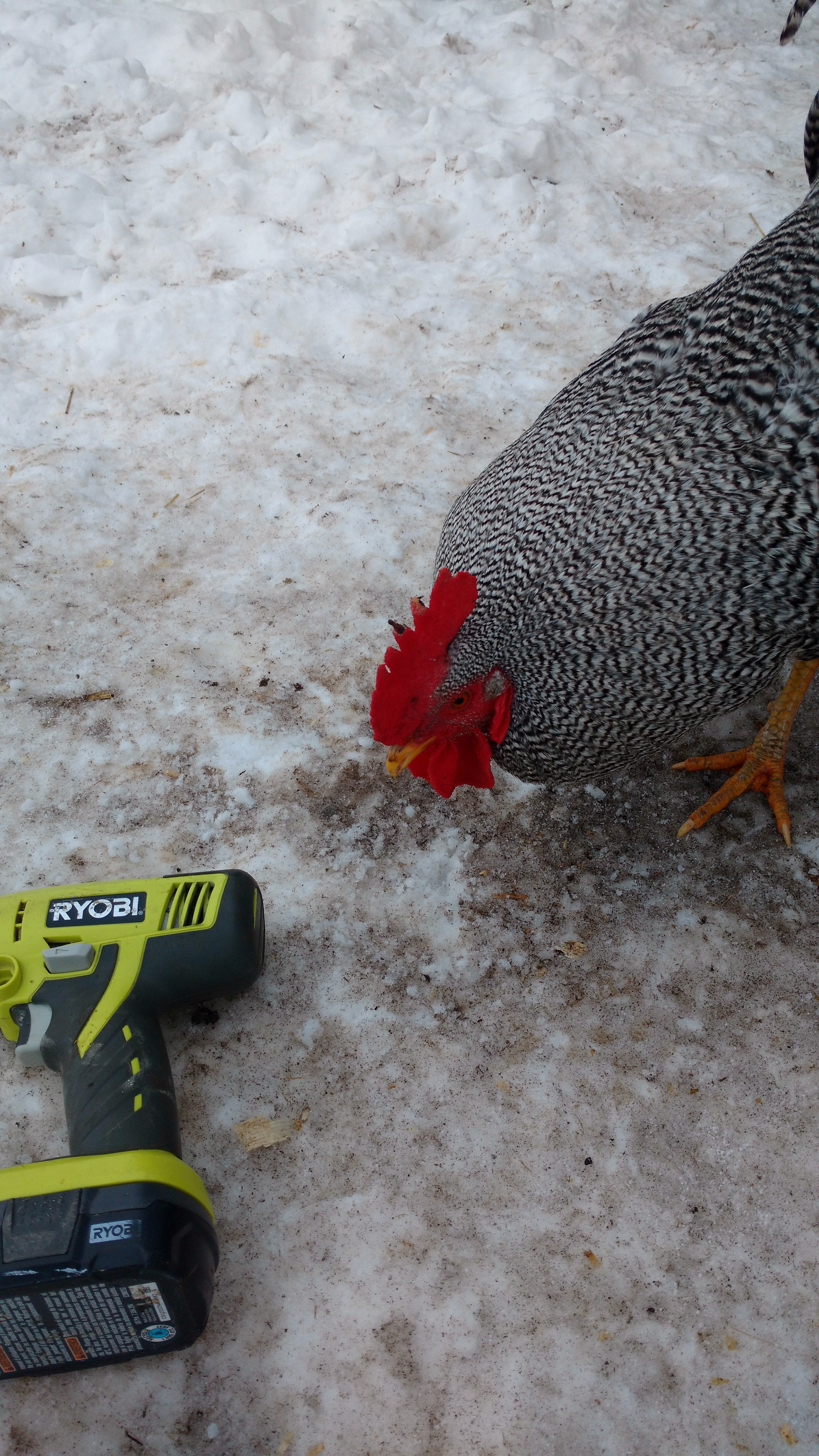Okay...its rarely even been below zero here this winter..i think maybe -6 was the coldest so far at night...im discounting frostbite, especially in the coop as its well built, ventilated properly etc etc....but could you folks look closely at Earl's comb and make a suggestion as to what might be happening....its like the fleshy part of his comb has melted away to a core bit..all black...and yes, he's attacking my drill...lol...hes a feisty lad...