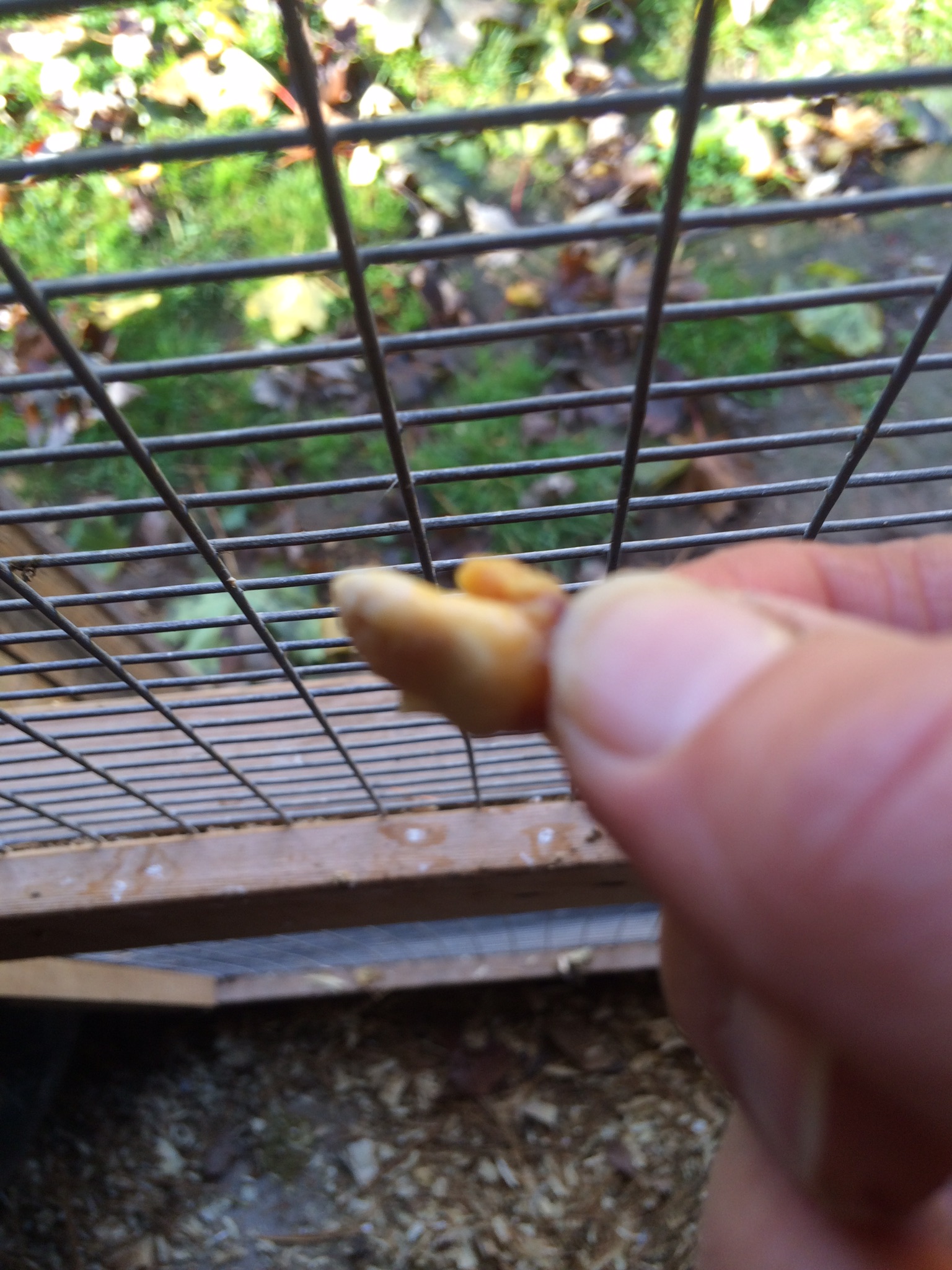 @Killerbunny, There are definite indications that she's on the mend: She's getting bored and crabby, which isn't like her. She's complaining when we don't let her past the crate door. She's picking at her bandage. She's now refusing to eat the antibiotic-infused bread (arghh). We did a dressing change last night, and the wound site was clean, the area around the sutures didn't look at all irritated. We've been putting her out in the run inside her crate with the others every day, and bring her in at night for meds, etc. Hubby says that during the day the others take their siestas sitting near her and surrounding the crate. We're going to try letting her out in the run with the rest of them during the day on Saturday when we are able to observe, but we want to keep the bandaging on for at least until Sunday, just in case the other girls are still too interested in her wound site and her sutures. Cautiously optimistic for a full recovery.