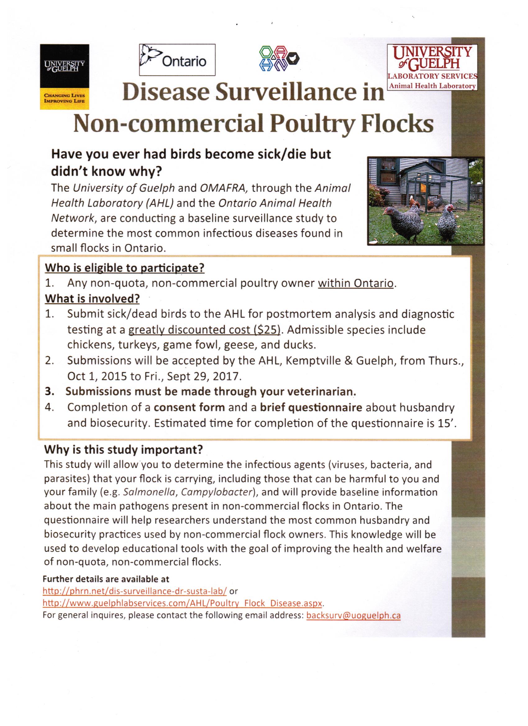 OMAFRA & The Animal Health Lab in Guelph Ontario have asked me push out the information on a new Small Flock Subsidized Surveillance Program being offered by them. Please see the flyer below for more info. It is a great resource point at a greatly discounted rate for most all forms of testing .Please read the flyer and visit the website.. I am only the messenger.. questions should be directed to them not me...lol.... Also please find a resource booklet put out by Merck on Important Poultry Diseases. Also a great resource guide.