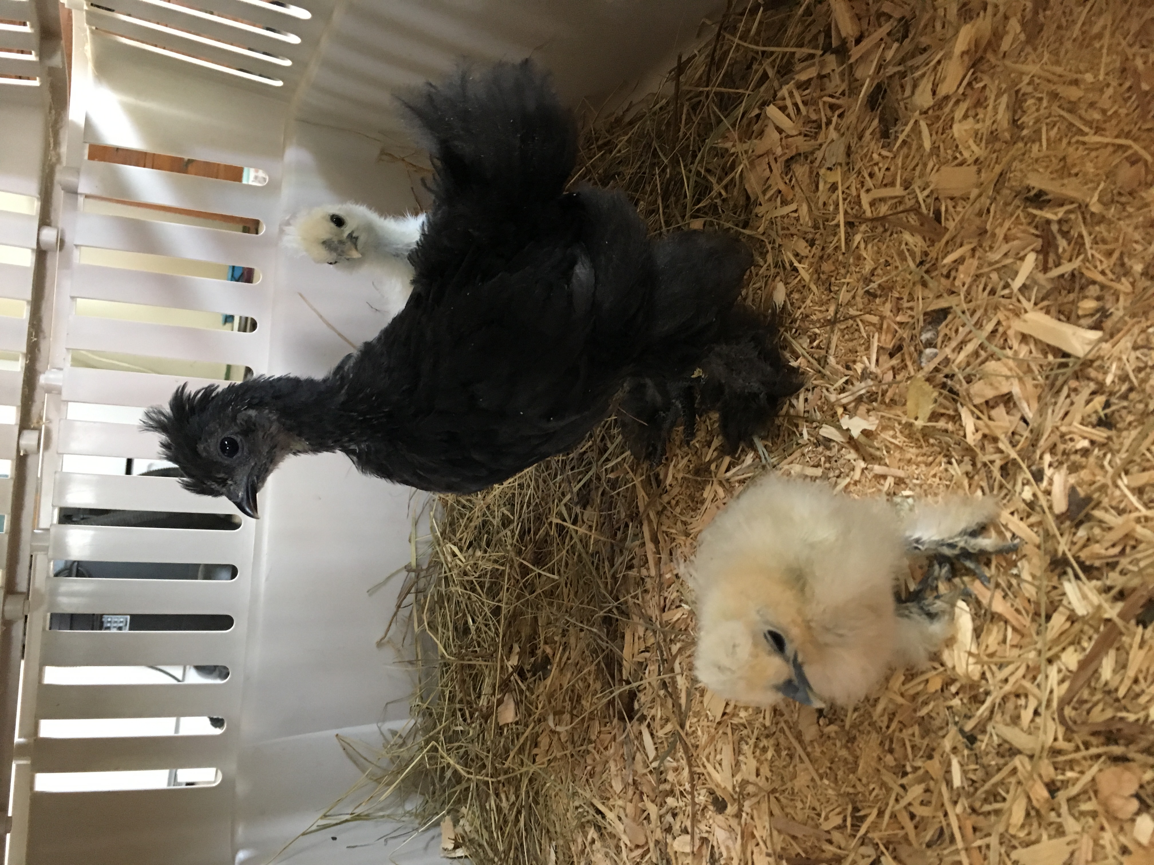 Have a listless, crying chick. Is it the heat? Her companions are panting, she is not. Closing her eyes and twitching her head a bit to the side. Helped her to drink. Haven't seen the others pick on her.. She is the same age as the other white chick but hasn't grown well. The black chick is a week older. Have moved them to a cooler place.