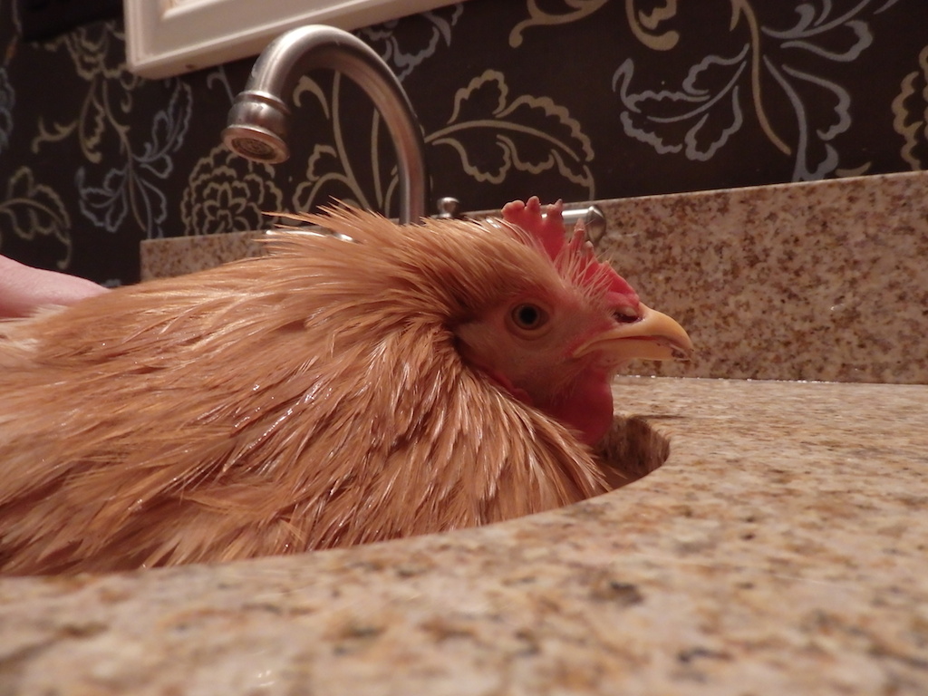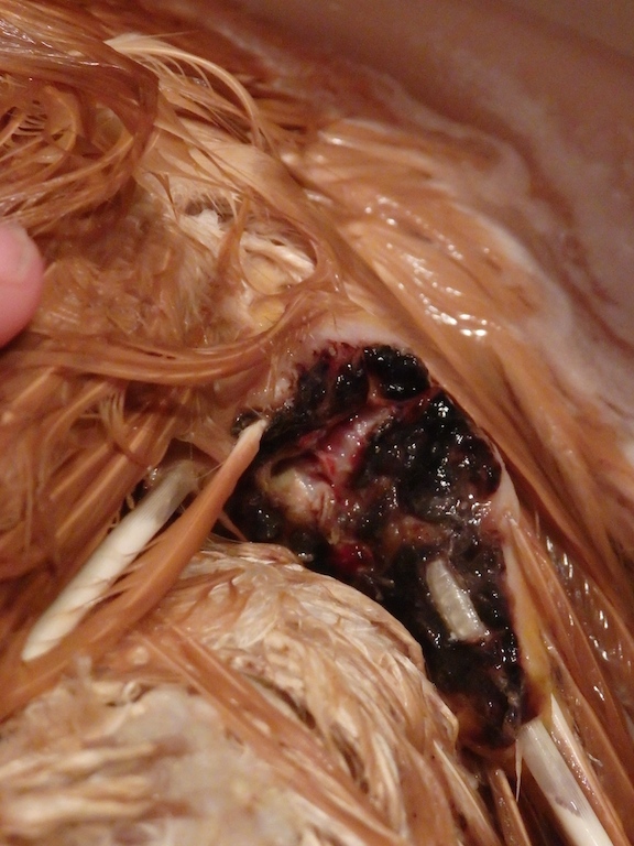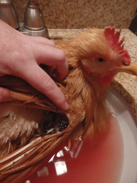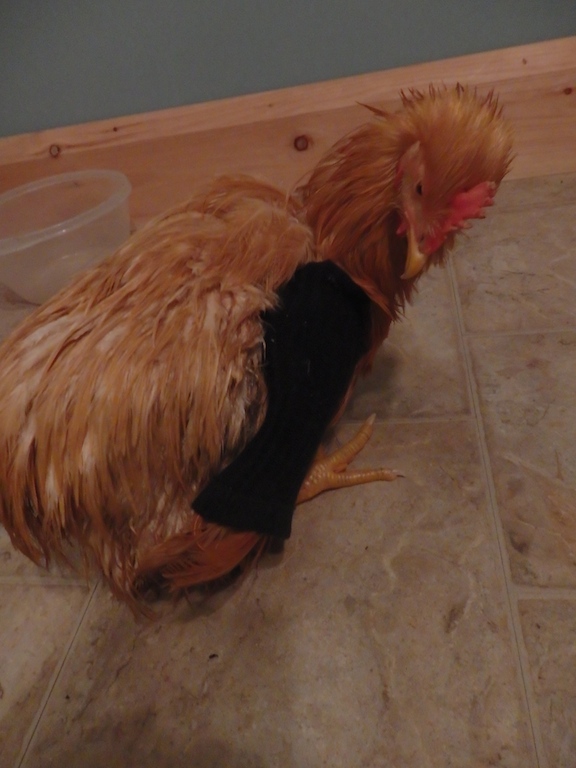 Ok so about 3 days ago I removed this cockerel (pretty sure, correct me if I am wrong!) from my flock, he was getting picked on. I brought him over and put him in with my ducks. Over the last couple of days he has been pecking at himself and this morning he was covered in blood! So I brought him in the house, gave him a bath and found the source of his problem. I cleaned it up and put polysporin on it and will keep him by himself until it hopefully heals. I stuck an old sock on his wing...he is not impressed. If anyone has any helpful advice I am all ears.