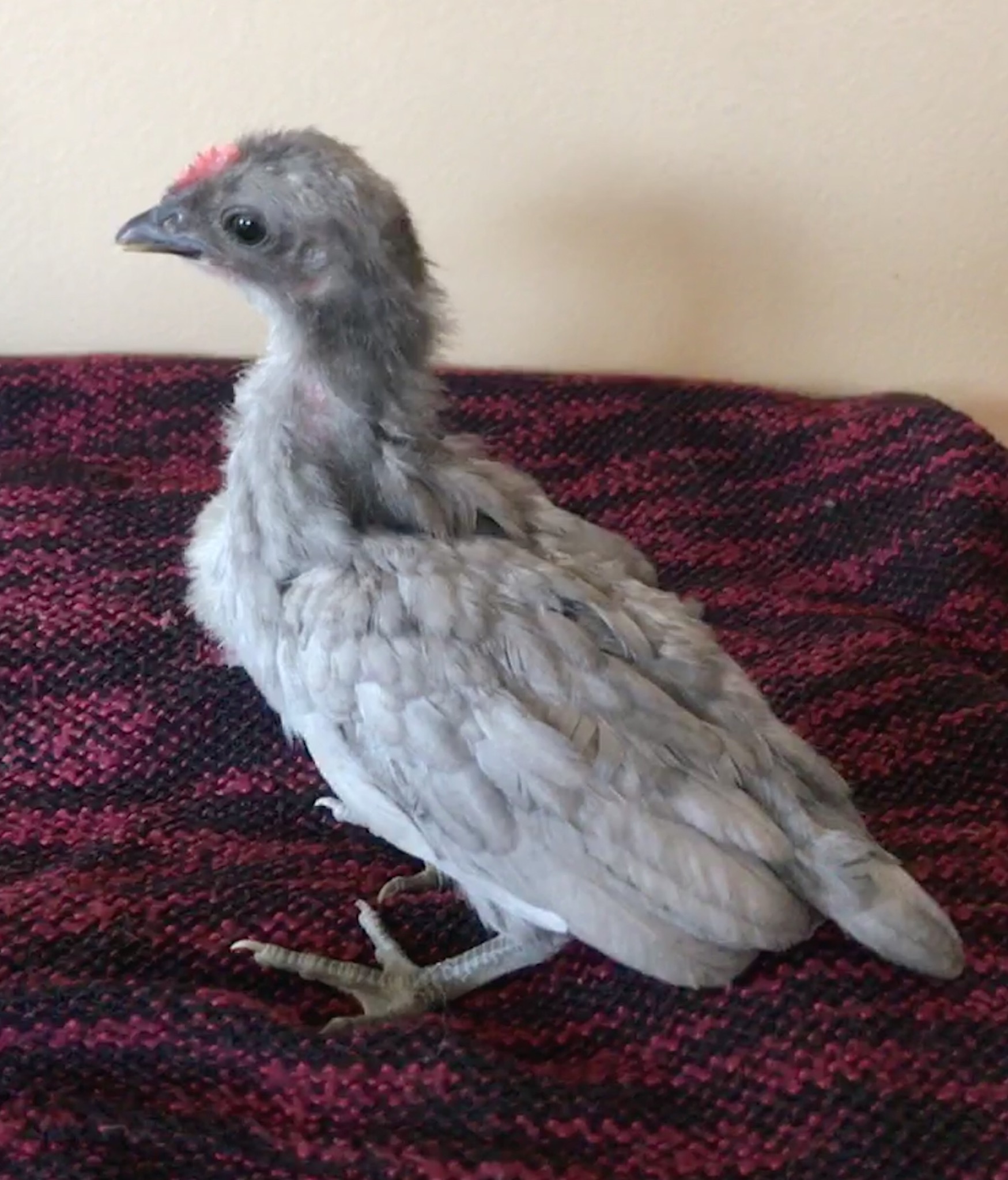The splash was a yellow chick. It just started getting the darker spots recently and I just thought it would be white til now. The blue was dark fluff all over. Looked black but feather grew in grey and it has lightened significantly over the weeks.
