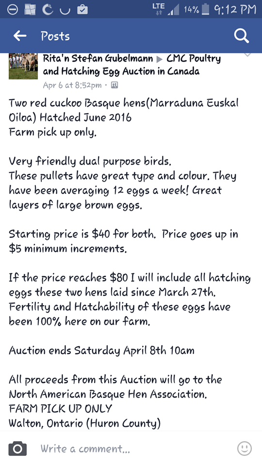 we are currently auctioning off 2 very nice pullets on CMC Poultry and Hatching Egg Auction in Canada on facebook with the proceeds going to the NABHA (North American Basque hen Association).