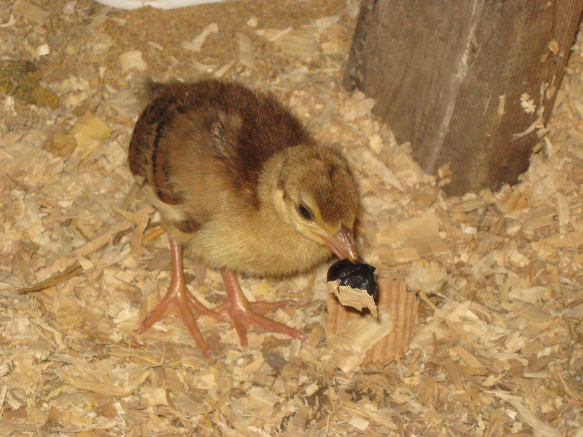 Yesterday's hatch of pea chicks. Can't believe how quick a day old is! I brought a couple of blueberries to give the peahen to tempt her off the nest. Wanted to do a head count and clean up the nest. One little character grabbed a blueberry from her and took off with it. The peafowl always amaze me how the peahen will give her food to her young. but really.....a day old and taking off with a whole blueberry![/attachment]