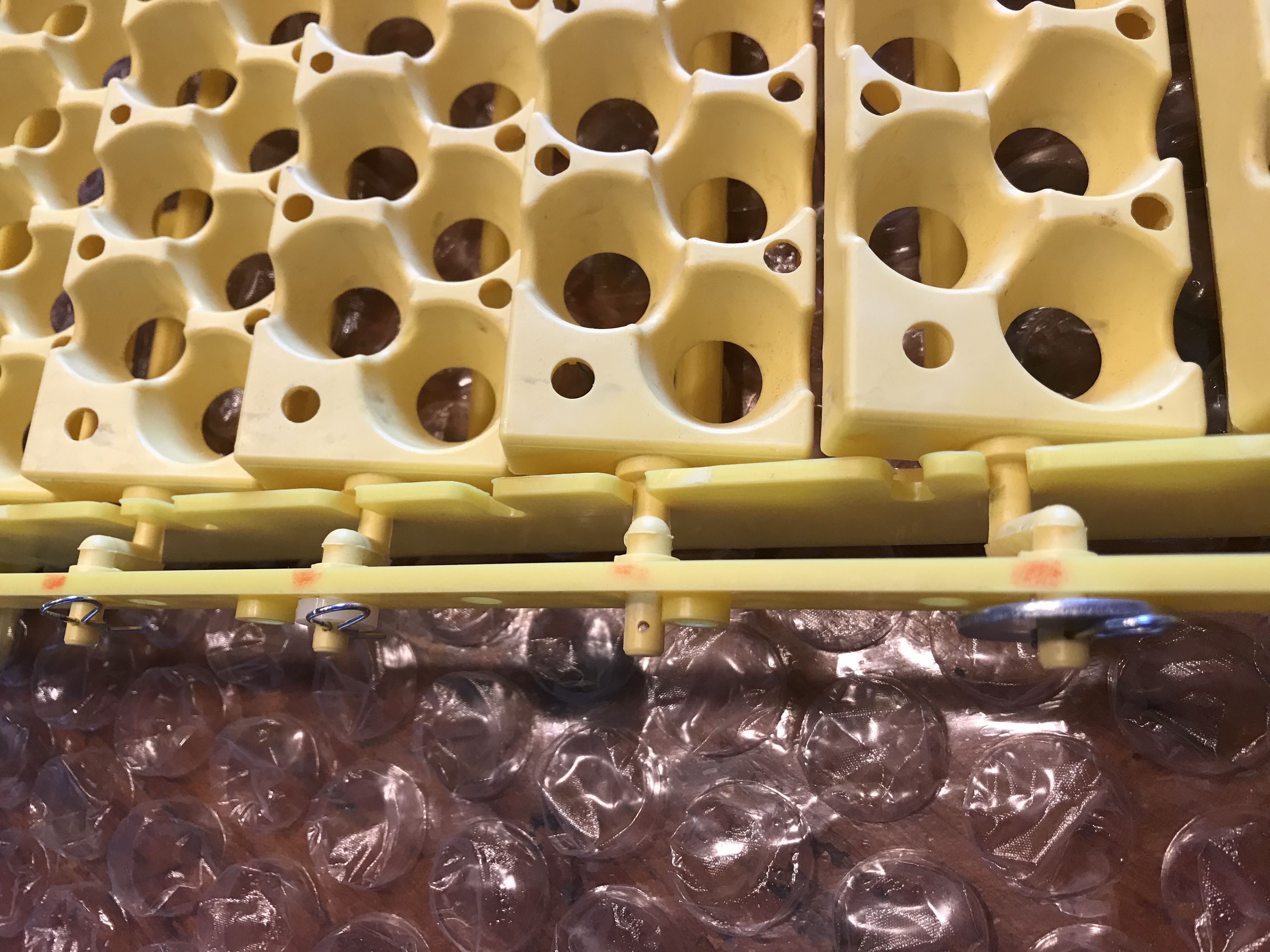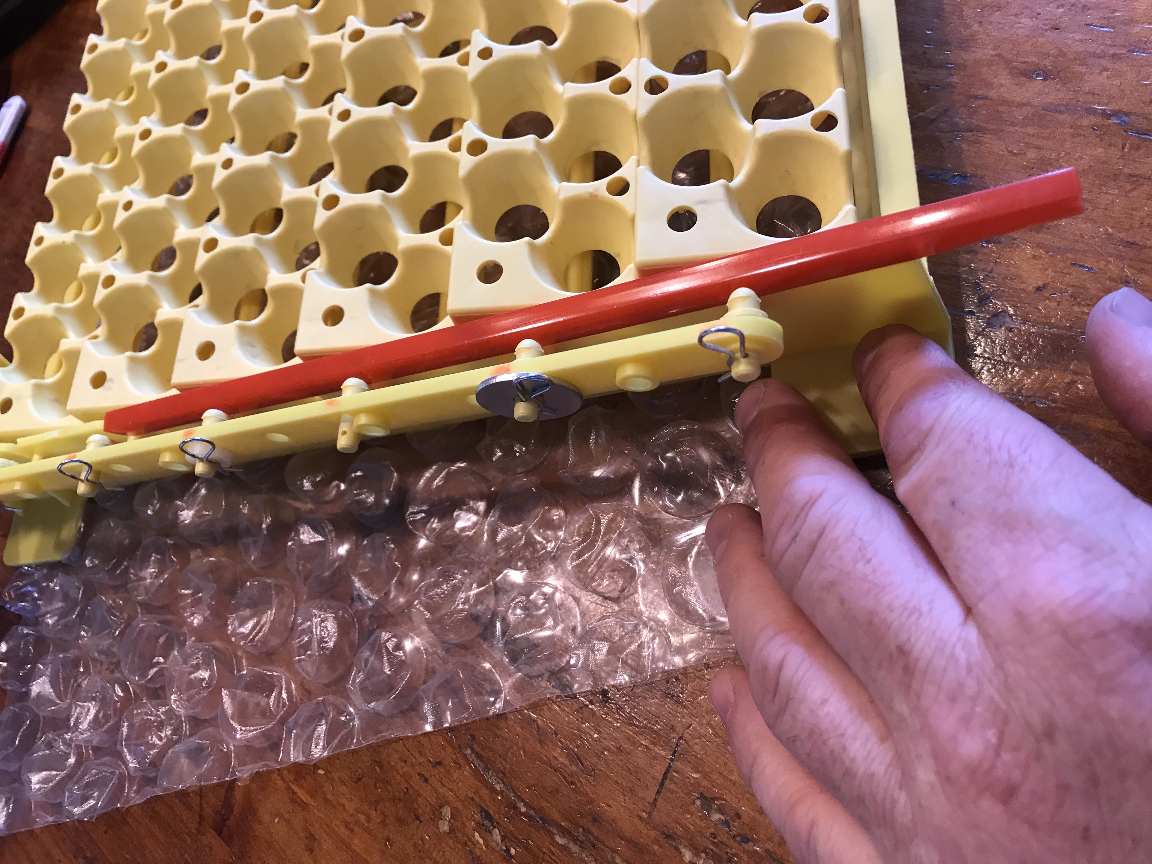 Circumstances and my needs have changed (and the big unit consumed 200 watts so hydro bills as well!) and I sold my sportsman and plugged in a “new to me” hovabator. The autoturner as well as the autoturner I am delivering to Wllady (from Ontariochick) are slightly different from my old one: there’s a piece missing! The old turner had a plastic sleeve to stop the egg racks from “jumping off track” from the turner frame. Its an easy fix - I bought a package of “report covers” from the dollar store and the spine works just as well. see the pics. (included the fix on Wllady’s unit)