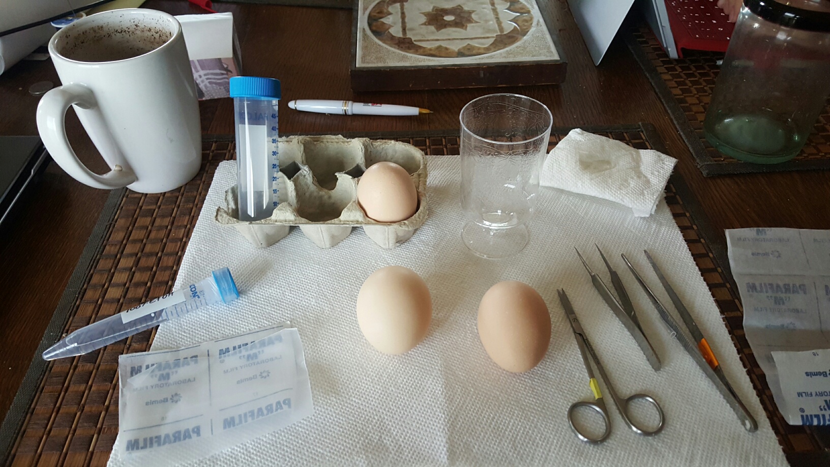alright.....here goes. earlier today i took 3 eggs, washed them off with ethanol. got an el cheapo plastic wine glass, got my surgical drape of paper towel set up and the all important mug of caffeine, and my fine tweezers and everything.....