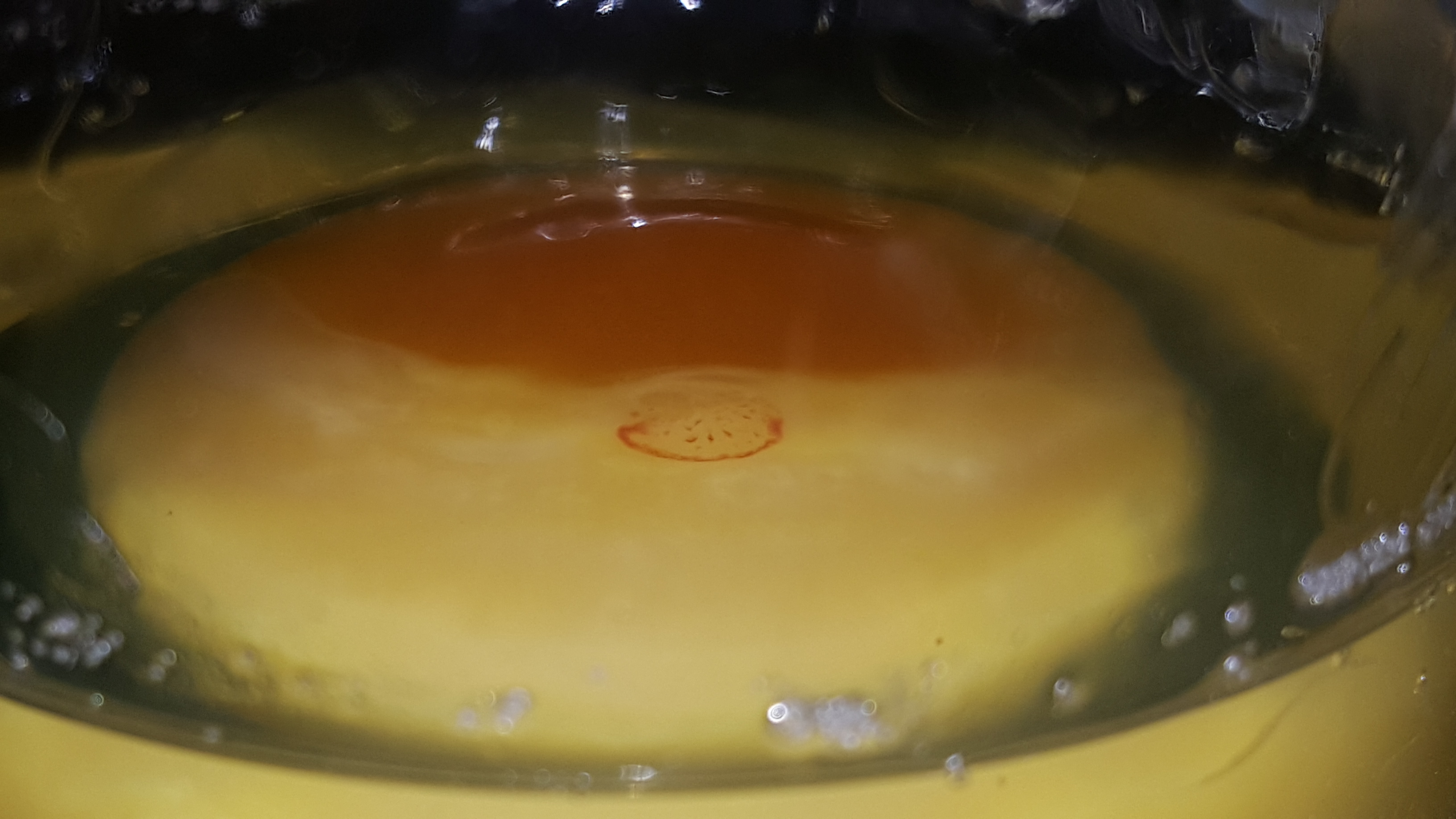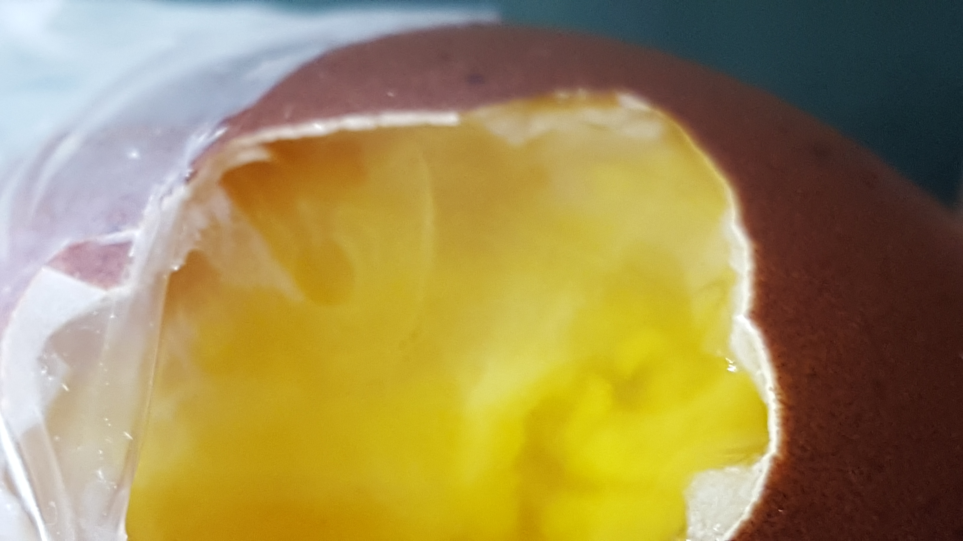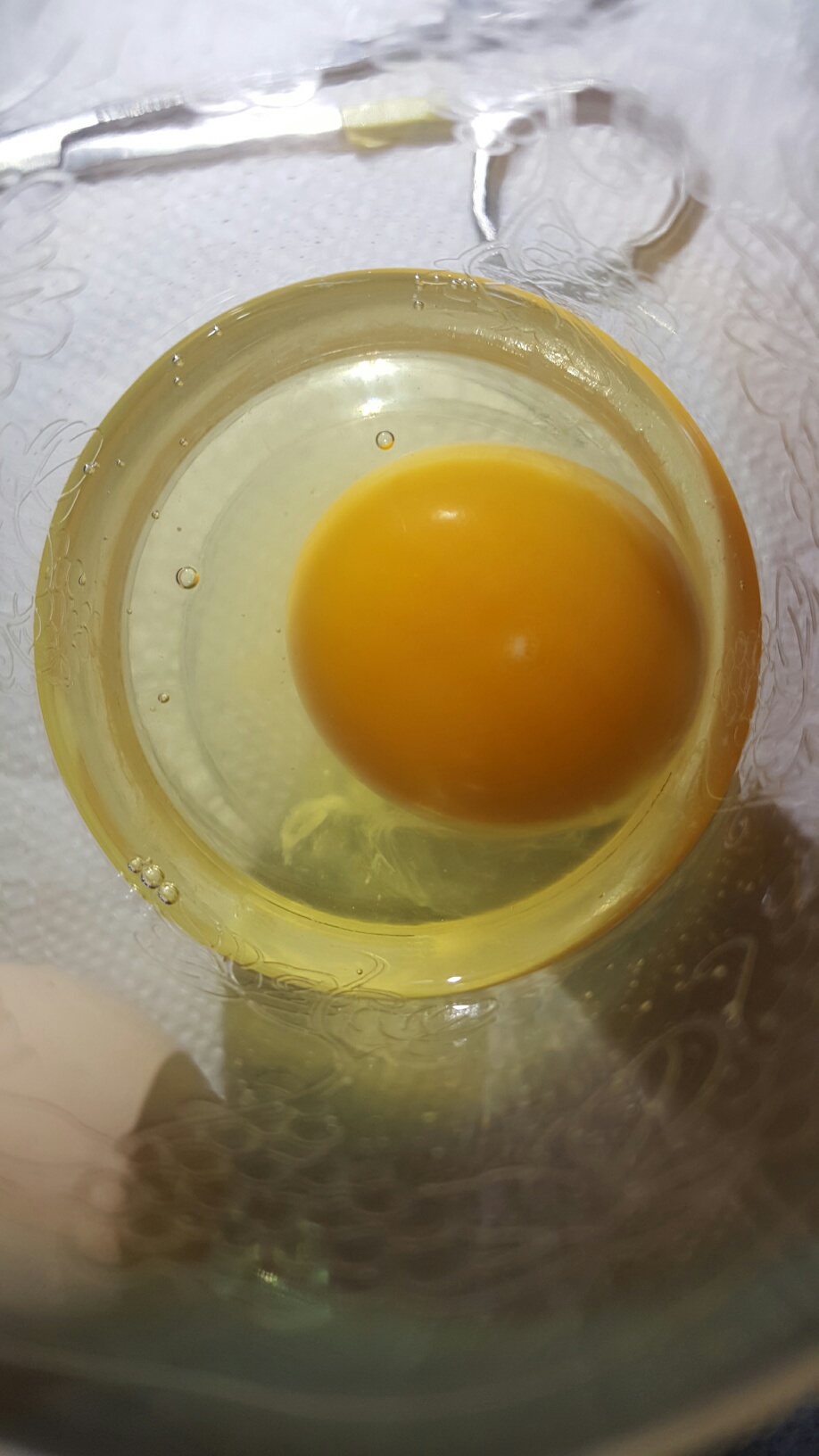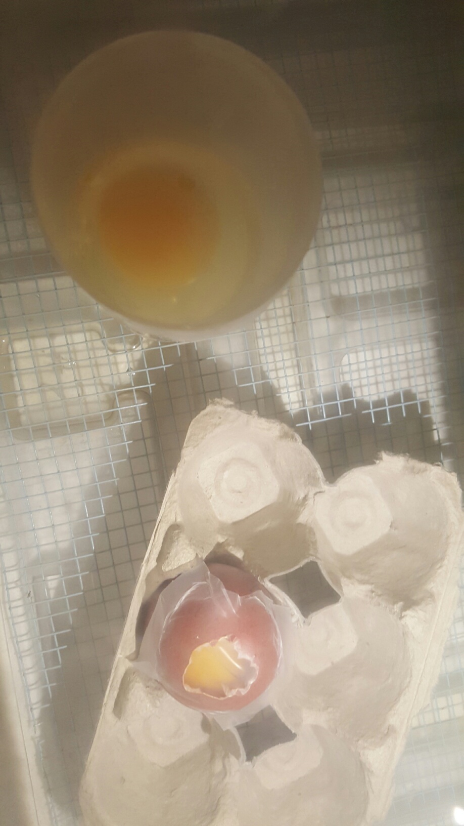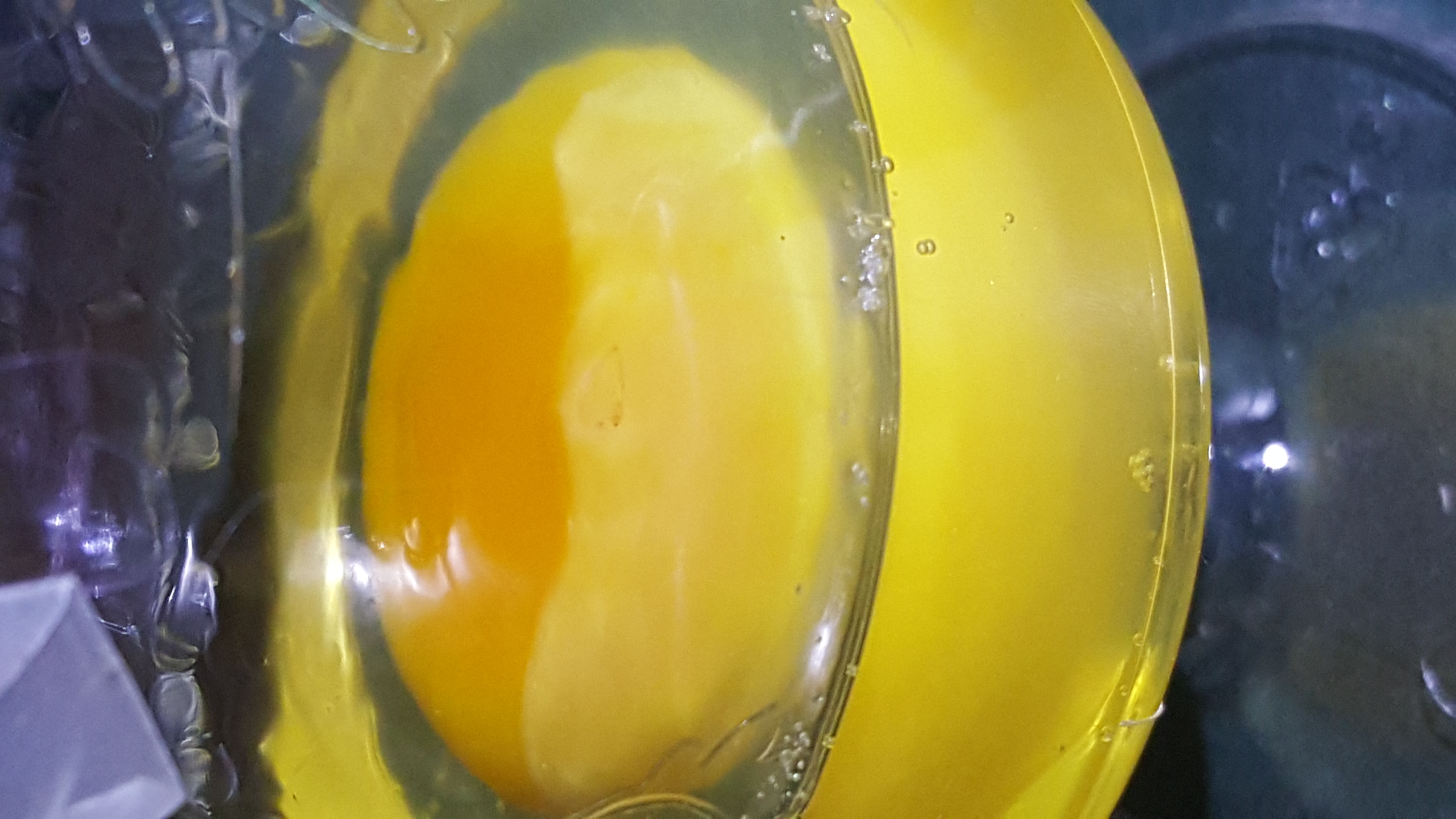 Then, took egg number 3 and chipped a hole carefully in the top, dissected out the membrane and shell and cursed the rooster....okay, he's 7 years old, and probably shooting blanks if he can even figure out what to do anymore.....the ovum is at almost 12 oclock right close to the egg shell