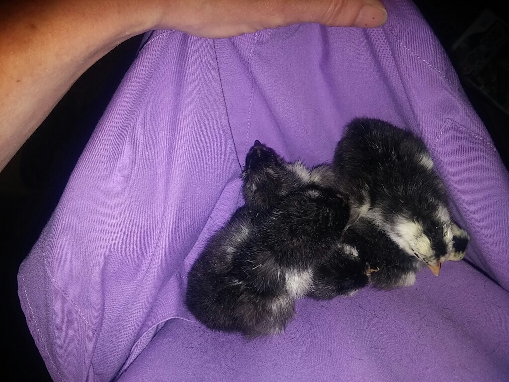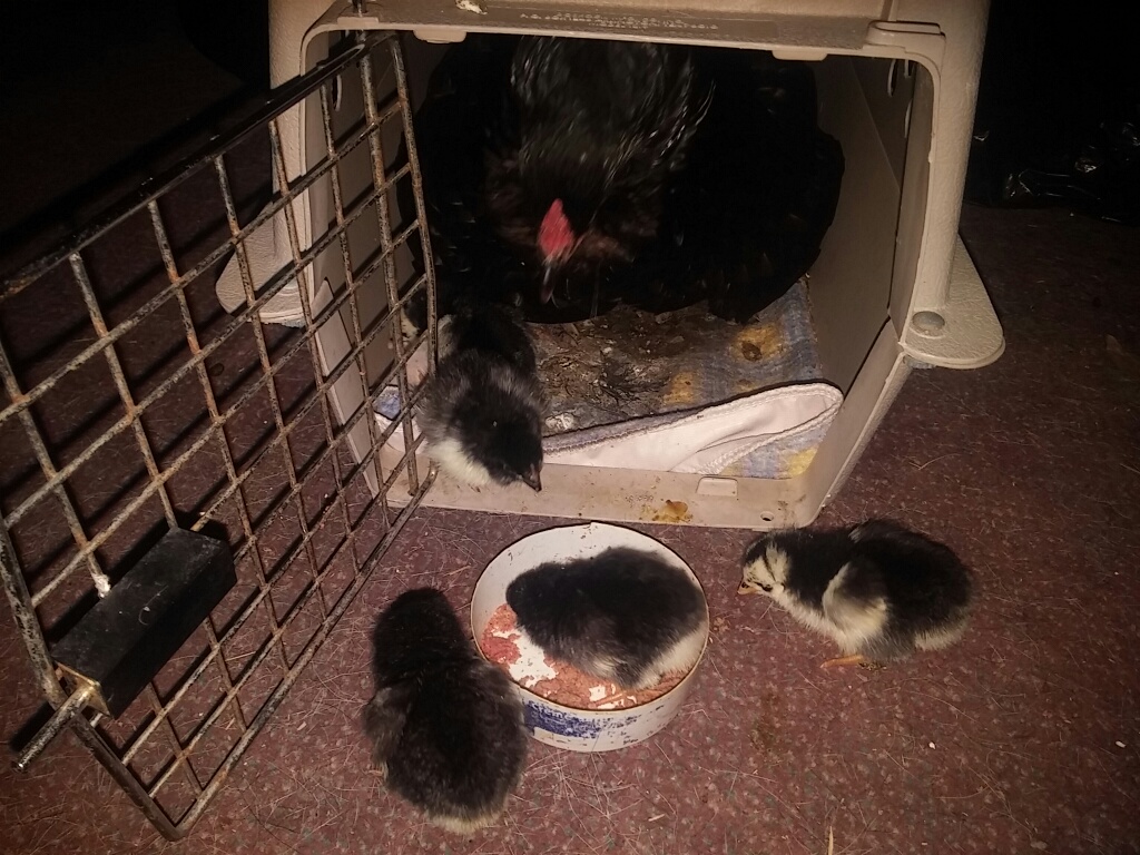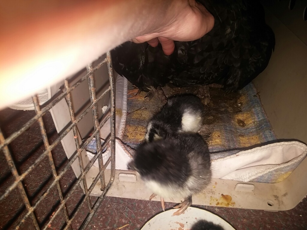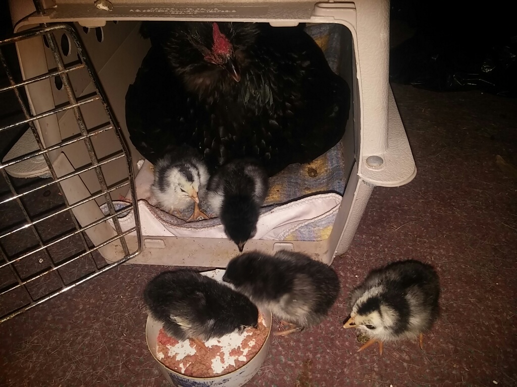 A special cockerel came back home to roost last fall, and was put right to work taking care of a small group of girls. The little buggers hid eggs from me this winter/spring, and when I finally found two nests with over 30 eggs, many had frozen or had got too cold to be viable. I put the ones that looked ok in the incubator, and had 13 start to develop, and 6 hatched. One hatched out of the wrong end of the egg, and although seems healthy and strong, he/she has a tiny bit of curly toe and I will probably have to make him wear shoes for a couple of days. I had a broody hen in the barn, less than two weeks ago she started sitting on six eggs that weren't developing (also got too cold), so I put her in a cat cage, brought her in the house, and started sneaking babies under her and taking eggs away. By morning, she was talking to them as if they'd hatched there, instant family! The original thought, was to graft the chicks onto her and then turf them all outside and let mama do all the hard work of raising them...but mama knows where she's got it good, and is refusing to lead them out. She is happy to parade them around the kitchen, and takes pleasure in terrorizing the dog. That's ok, it's still kind of cool and mucky outside, so they get to stay in for a few days so I can fix the one little guys' feet.