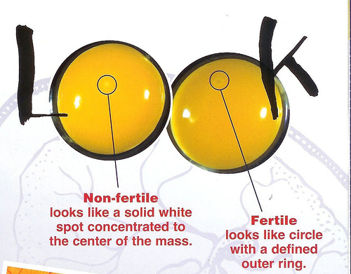 No, sorry, Sandy. Thanks for posting bigger pics. Those look to me like blastodiscs (unfertilized), not blastoderms (fertilized). Blastodiscs are slightly irregular shaped "dots" , whereas blastoderms have rounder concentric rings around a middle dot, like a dart board bullseye.