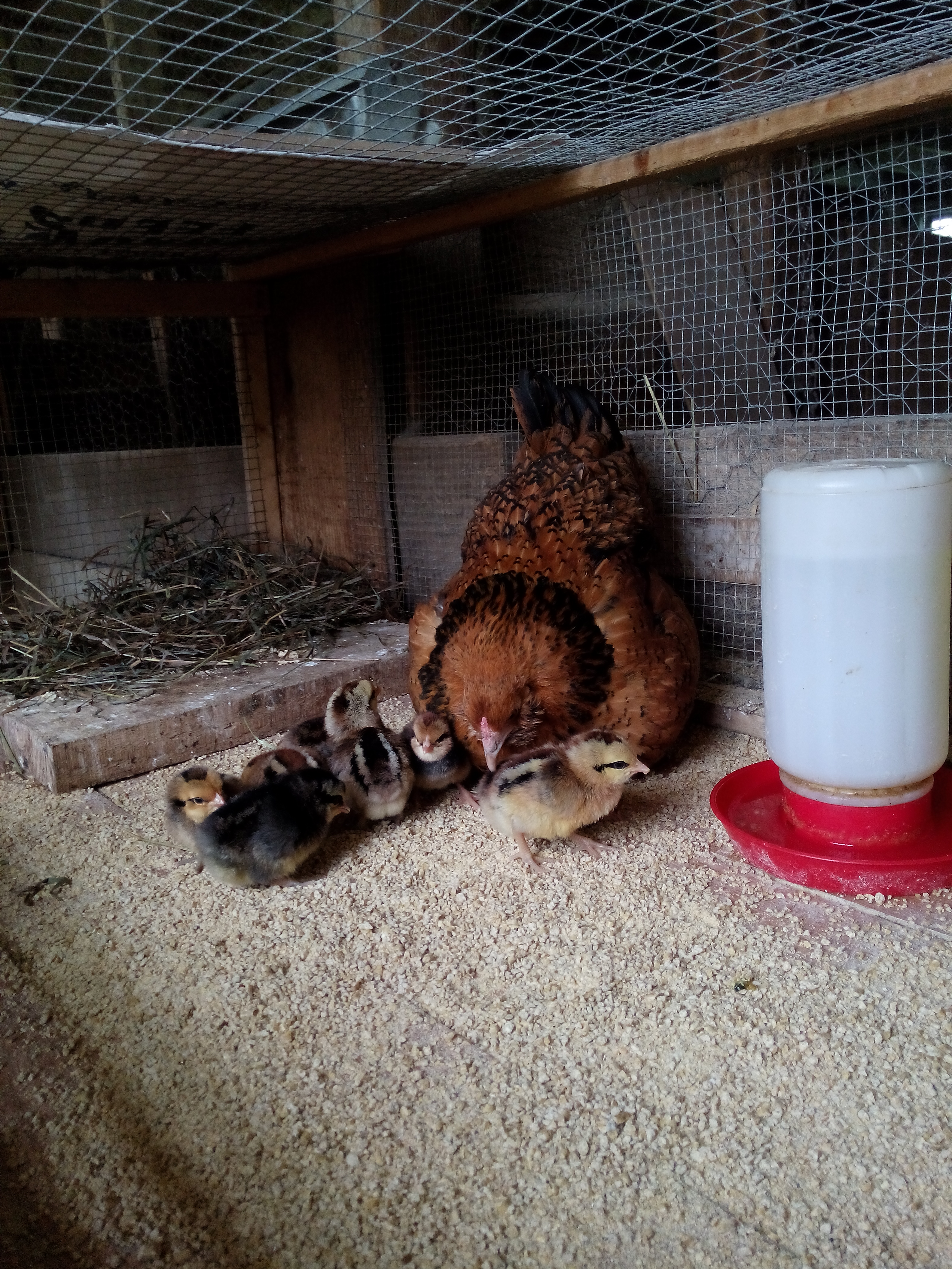 This little hen Sat on eleven eggs and since they seemed fertile I left them all, she hatched out eleven chicks! I think that is the most I ever let one have.