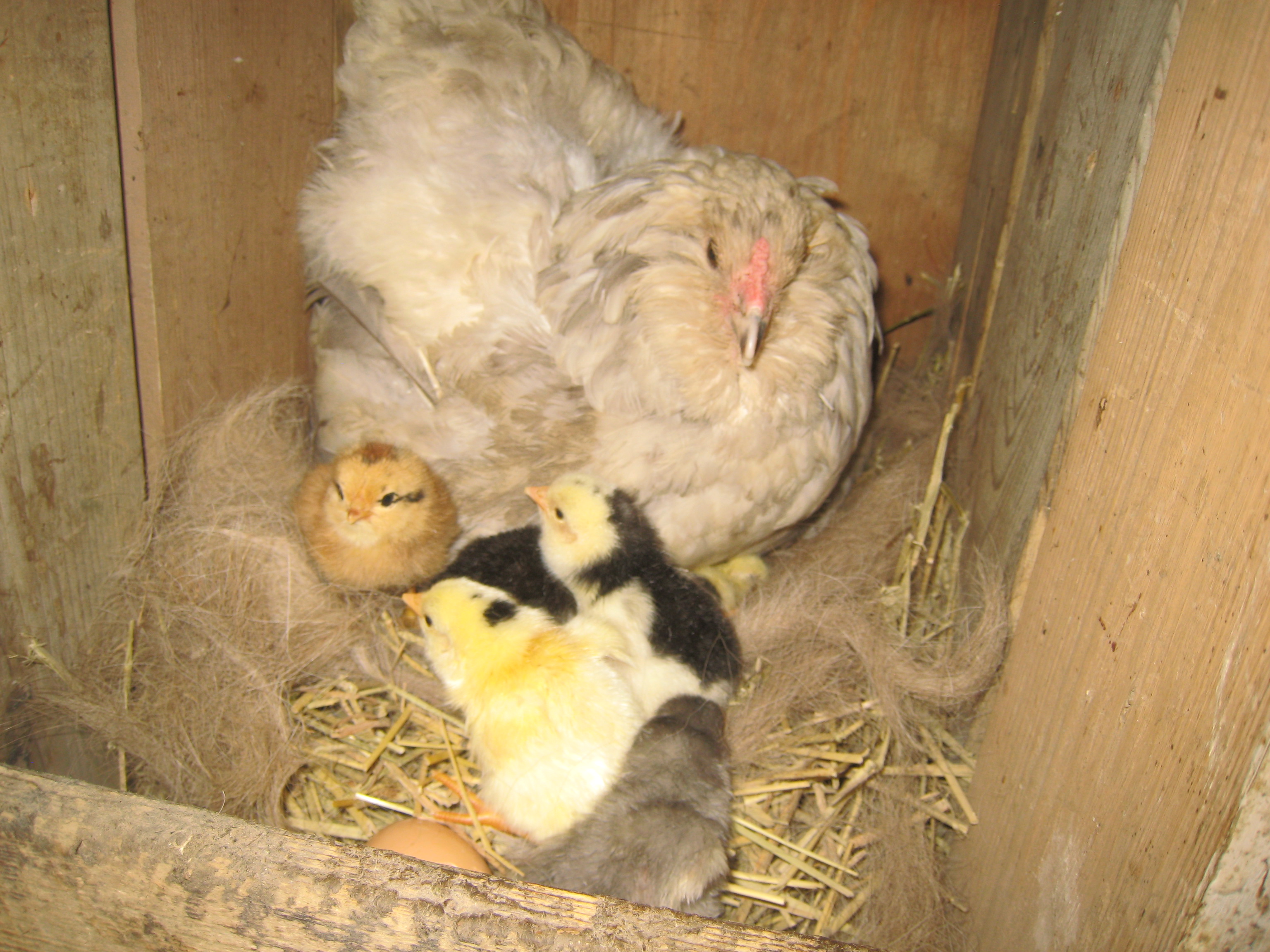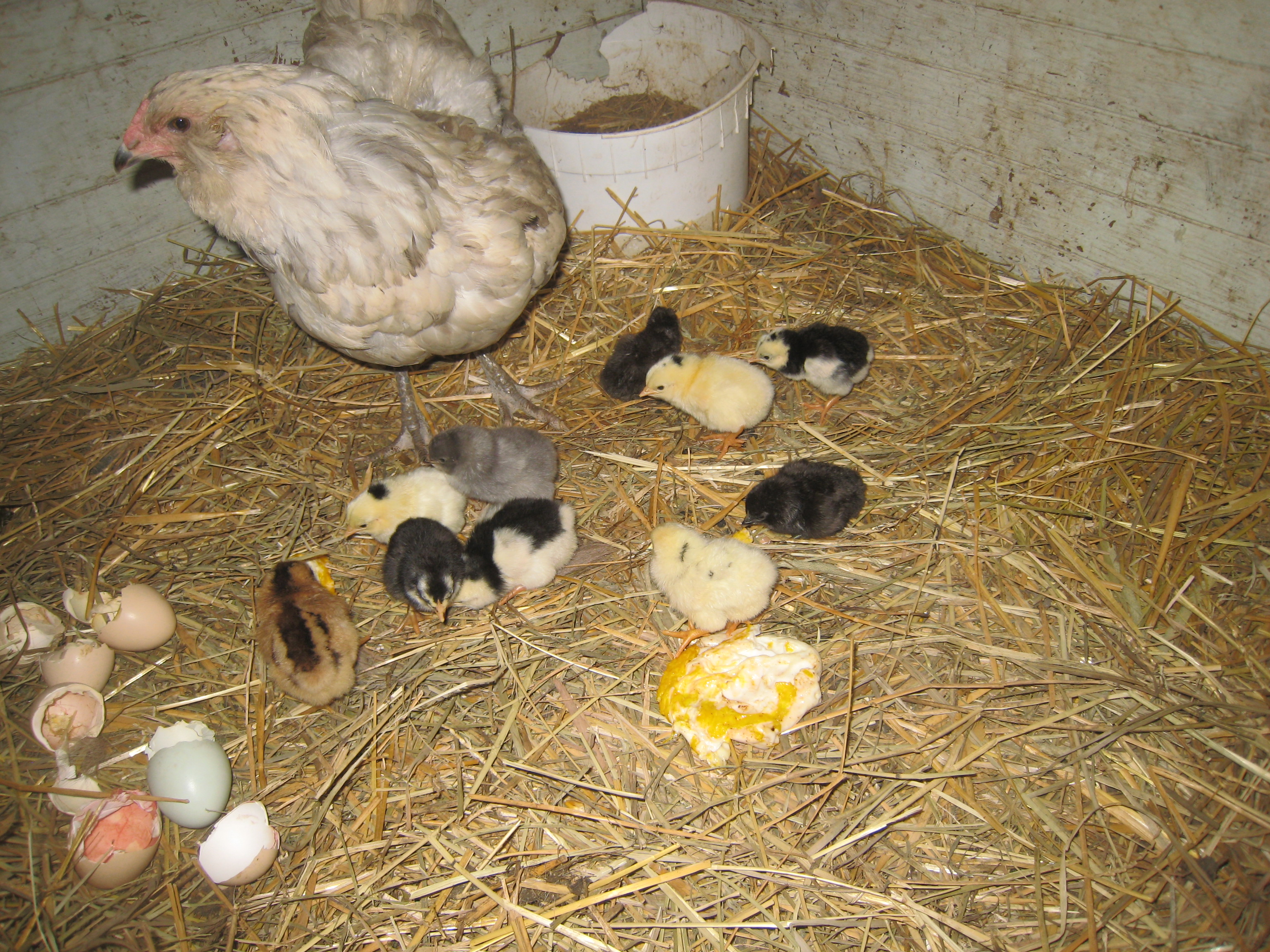 I am thinking, that Windwalking woof should change her handle to WWWW, the Wonderful Wind Walking Woof. She mailed me a dozen eggs from her bantie stock. And my splash hen Niagra sat on them patiently for 20 days. Once, I thought we might have lost them, came in in the eve and she was on the wrong nest, eggs were getting cool, put her back on and it looks like it worked. Eight fully hatched so far, a couple more pipping. It never gets old.