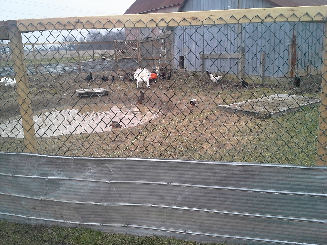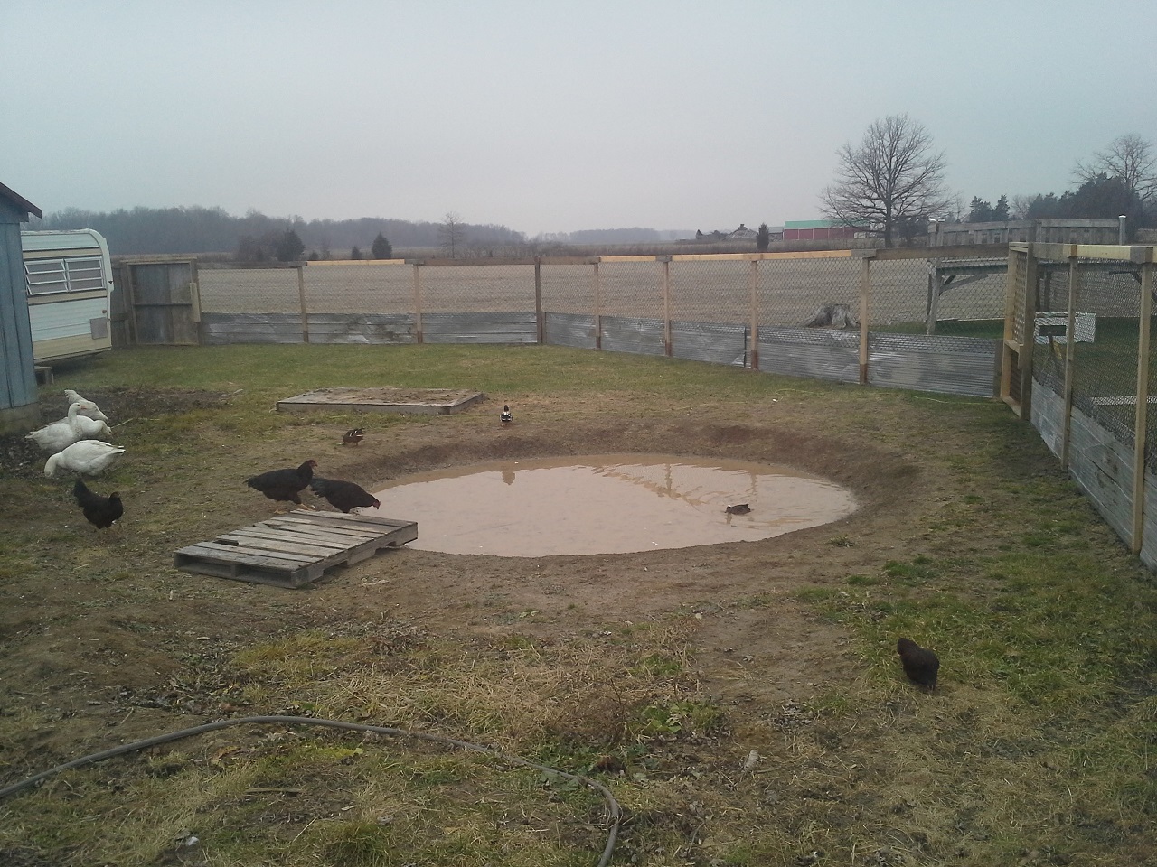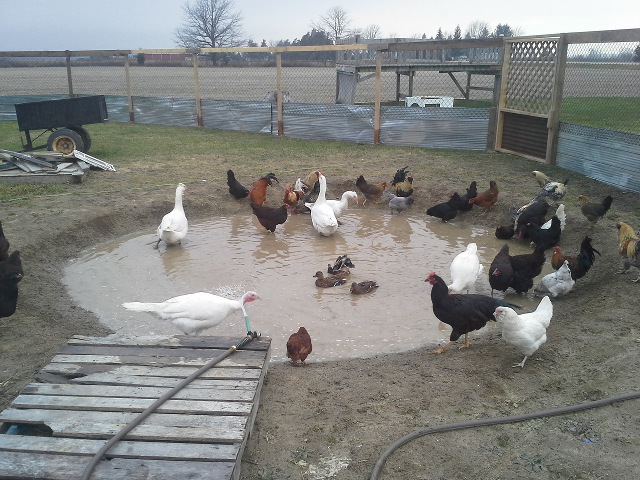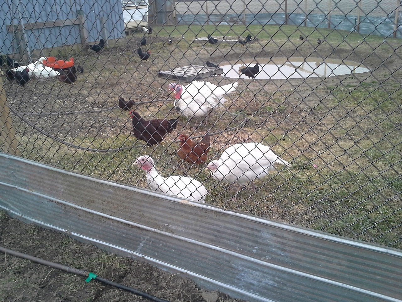HAHAHA! Well Im not done but finally able to let my birds out at the new house! This chicken run and the coops are about 3000 sq. feet in total :rofl1: I finished the gates today... so much for building one and closing in the others HAHA! I built all 3. I need to add a 2x6 with 9 inch nails down into the ground under the gates to make it completely safe from digging. while i was finishing up the gate I filled up the pond with the hose. I put about 8" or so in so it was ready for the ducks and geese when I let them out. I finished cutting the hole on the wall and kicked it in lol, then cleaned up the sharp metal edges, stood back and let them fly out the door... all the birds ended up in the pond lol and the ducks stood on the side wondering what the heck all these chickens were doing in there pond, LOL. the geese needed to be chased out of the coop but once out never came back in. man do the ducks and geese love being in the water and do I ever love seeing them act like water fowl! Once they were all out and i took some pics and videos and then i went back to work. I really cleaned up and restructured the bird door. complete with vinyl siding corners and a roof. Im guna put something on the roof, maybe i'll just get some black silicone and smear it all over with a putty knife. So far this has still only cost me $30, But i used a tonne of screws, probably 2000 3" gold deck screws, the cheap ones... still havent seen one rust in about 5 years of using them. My father in law hooked me up with a bucket of fence nails, a bunch of gate hardware, some hinges, and other spare part for future projects. :rofl1: The pond is still holding water, apx the same amount as i put in it and I no longer see bubbles coming up. Hopefully my plan of doing nothing and letting the birds build the pond might just work after all ;-) haha ill see tomorrow morning if theres any left.