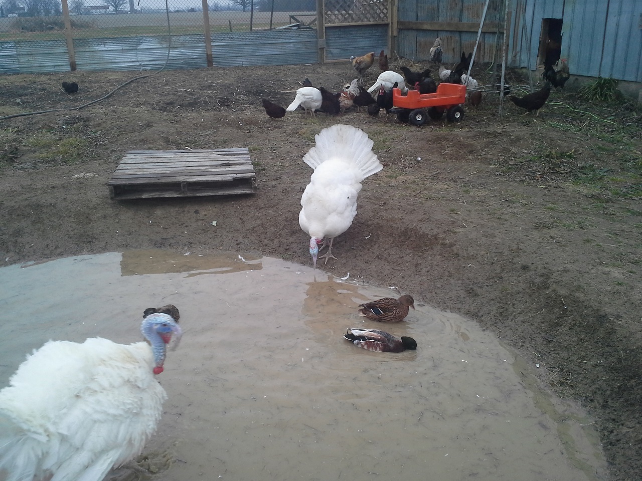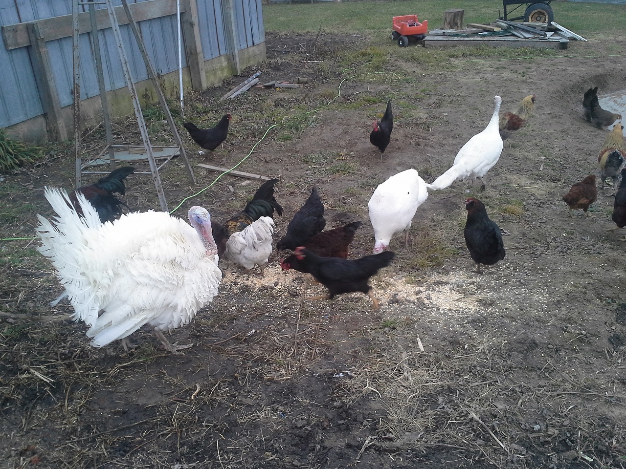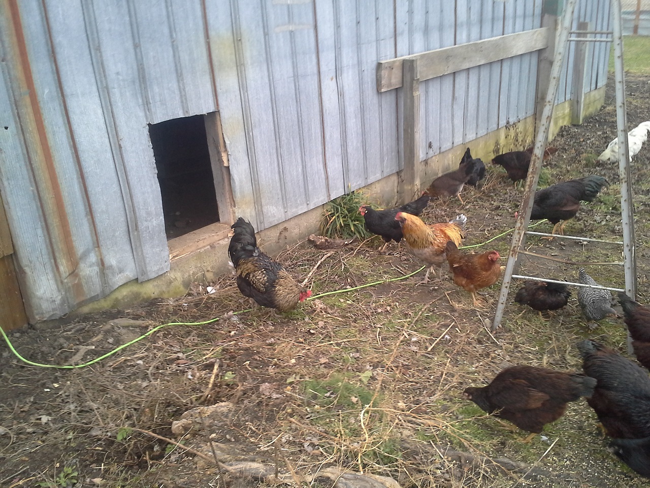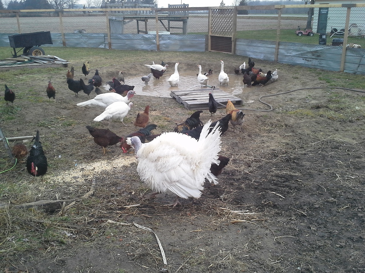 HAHAHA! Well Im not done but finally able to let my birds out at the new house! This chicken run and the coops are about 3000 sq. feet in total :rofl1: I finished the gates today... so much for building one and closing in the others HAHA! I built all 3. I need to add a 2x6 with 9 inch nails down into the ground under the gates to make it completely safe from digging. while i was finishing up the gate I filled up the pond with the hose. I put about 8" or so in so it was ready for the ducks and geese when I let them out. I finished cutting the hole on the wall and kicked it in lol, then cleaned up the sharp metal edges, stood back and let them fly out the door... all the birds ended up in the pond lol and the ducks stood on the side wondering what the heck all these chickens were doing in there pond, LOL. the geese needed to be chased out of the coop but once out never came back in. man do the ducks and geese love being in the water and do I ever love seeing them act like water fowl! Once they were all out and i took some pics and videos and then i went back to work. I really cleaned up and restructured the bird door. complete with vinyl siding corners and a roof. Im guna put something on the roof, maybe i'll just get some black silicone and smear it all over with a putty knife. So far this has still only cost me $30, But i used a tonne of screws, probably 2000 3" gold deck screws, the cheap ones... still havent seen one rust in about 5 years of using them. My father in law hooked me up with a bucket of fence nails, a bunch of gate hardware, some hinges, and other spare part for future projects. :rofl1: The pond is still holding water, apx the same amount as i put in it and I no longer see bubbles coming up. Hopefully my plan of doing nothing and letting the birds build the pond might just work after all ;-) haha ill see tomorrow morning if theres any left.