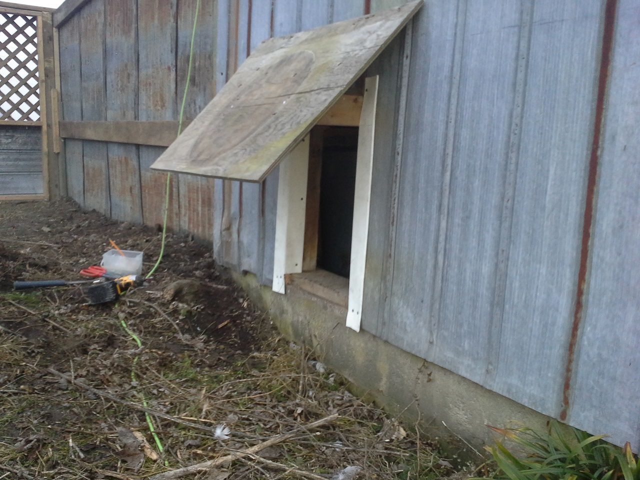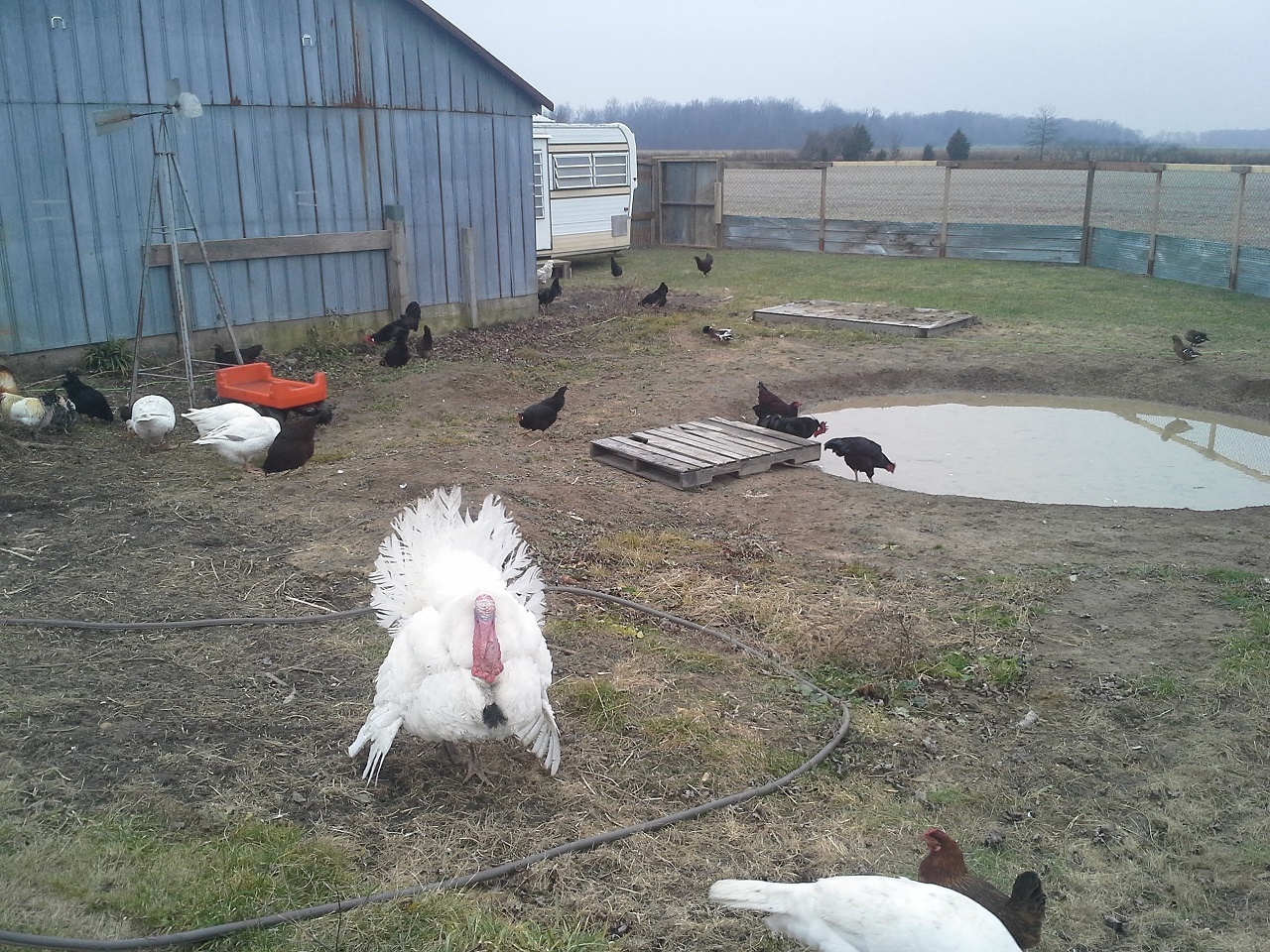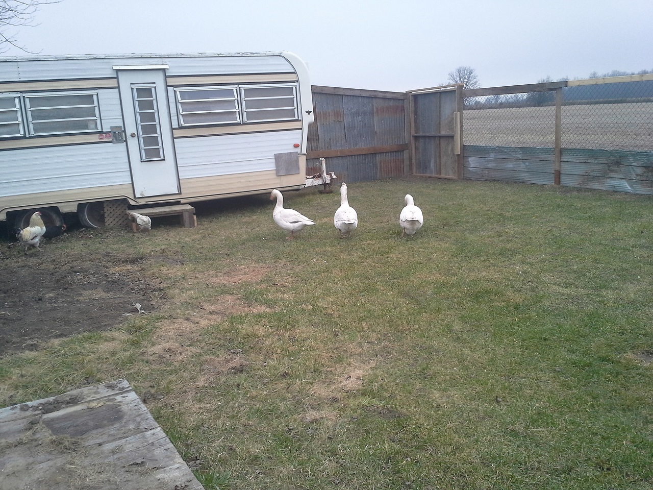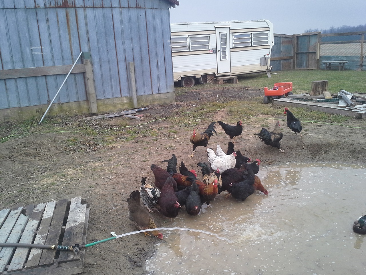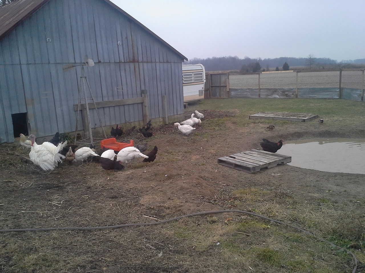 HAHAHA! Well Im not done but finally able to let my birds out at the new house! This chicken run and the coops are about 3000 sq. feet in total :rofl1: I finished the gates today... so much for building one and closing in the others HAHA! I built all 3. I need to add a 2x6 with 9 inch nails down into the ground under the gates to make it completely safe from digging. while i was finishing up the gate I filled up the pond with the hose. I put about 8" or so in so it was ready for the ducks and geese when I let them out. I finished cutting the hole on the wall and kicked it in lol, then cleaned up the sharp metal edges, stood back and let them fly out the door... all the birds ended up in the pond lol and the ducks stood on the side wondering what the heck all these chickens were doing in there pond, LOL. the geese needed to be chased out of the coop but once out never came back in. man do the ducks and geese love being in the water and do I ever love seeing them act like water fowl! Once they were all out and i took some pics and videos and then i went back to work. I really cleaned up and restructured the bird door. complete with vinyl siding corners and a roof. Im guna put something on the roof, maybe i'll just get some black silicone and smear it all over with a putty knife. So far this has still only cost me $30, But i used a tonne of screws, probably 2000 3" gold deck screws, the cheap ones... still havent seen one rust in about 5 years of using them. My father in law hooked me up with a bucket of fence nails, a bunch of gate hardware, some hinges, and other spare part for future projects. :rofl1: The pond is still holding water, apx the same amount as i put in it and I no longer see bubbles coming up. Hopefully my plan of doing nothing and letting the birds build the pond might just work after all ;-) haha ill see tomorrow morning if theres any left.