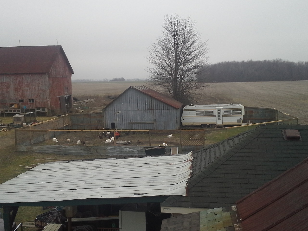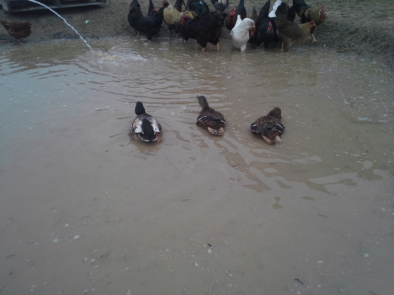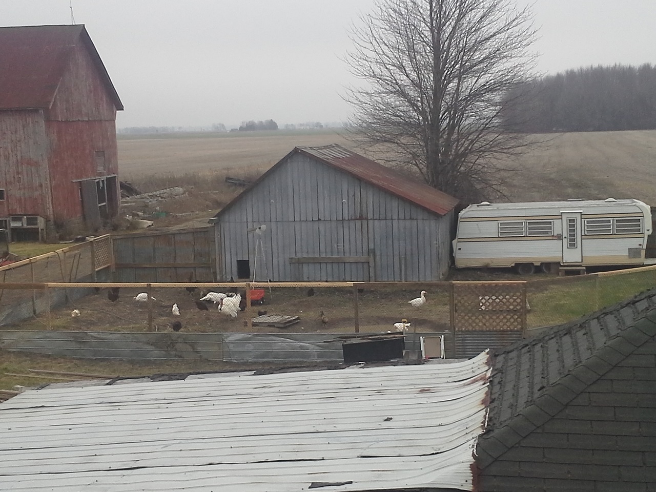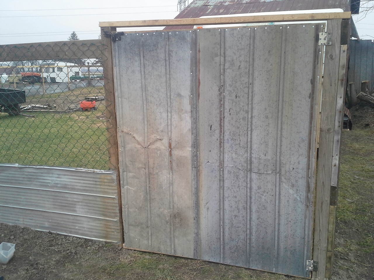HAHAHA! Well Im not done but finally able to let my birds out at the new house! This chicken run and the coops are about 3000 sq. feet in total :rofl1: I finished the gates today... so much for building one and closing in the others HAHA! I built all 3. I need to add a 2x6 with 9 inch nails down into the ground under the gates to make it completely safe from digging. while i was finishing up the gate I filled up the pond with the hose. I put about 8" or so in so it was ready for the ducks and geese when I let them out. I finished cutting the hole on the wall and kicked it in lol, then cleaned up the sharp metal edges, stood back and let them fly out the door... all the birds ended up in the pond lol and the ducks stood on the side wondering what the heck all these chickens were doing in there pond, LOL. the geese needed to be chased out of the coop but once out never came back in. man do the ducks and geese love being in the water and do I ever love seeing them act like water fowl! Once they were all out and i took some pics and videos and then i went back to work. I really cleaned up and restructured the bird door. complete with vinyl siding corners and a roof. Im guna put something on the roof, maybe i'll just get some black silicone and smear it all over with a putty knife. So far this has still only cost me $30, But i used a tonne of screws, probably 2000 3" gold deck screws, the cheap ones... still havent seen one rust in about 5 years of using them. My father in law hooked me up with a bucket of fence nails, a bunch of gate hardware, some hinges, and other spare part for future projects. :rofl1: The pond is still holding water, apx the same amount as i put in it and I no longer see bubbles coming up. Hopefully my plan of doing nothing and letting the birds build the pond might just work after all ;-) haha ill see tomorrow morning if theres any left.
