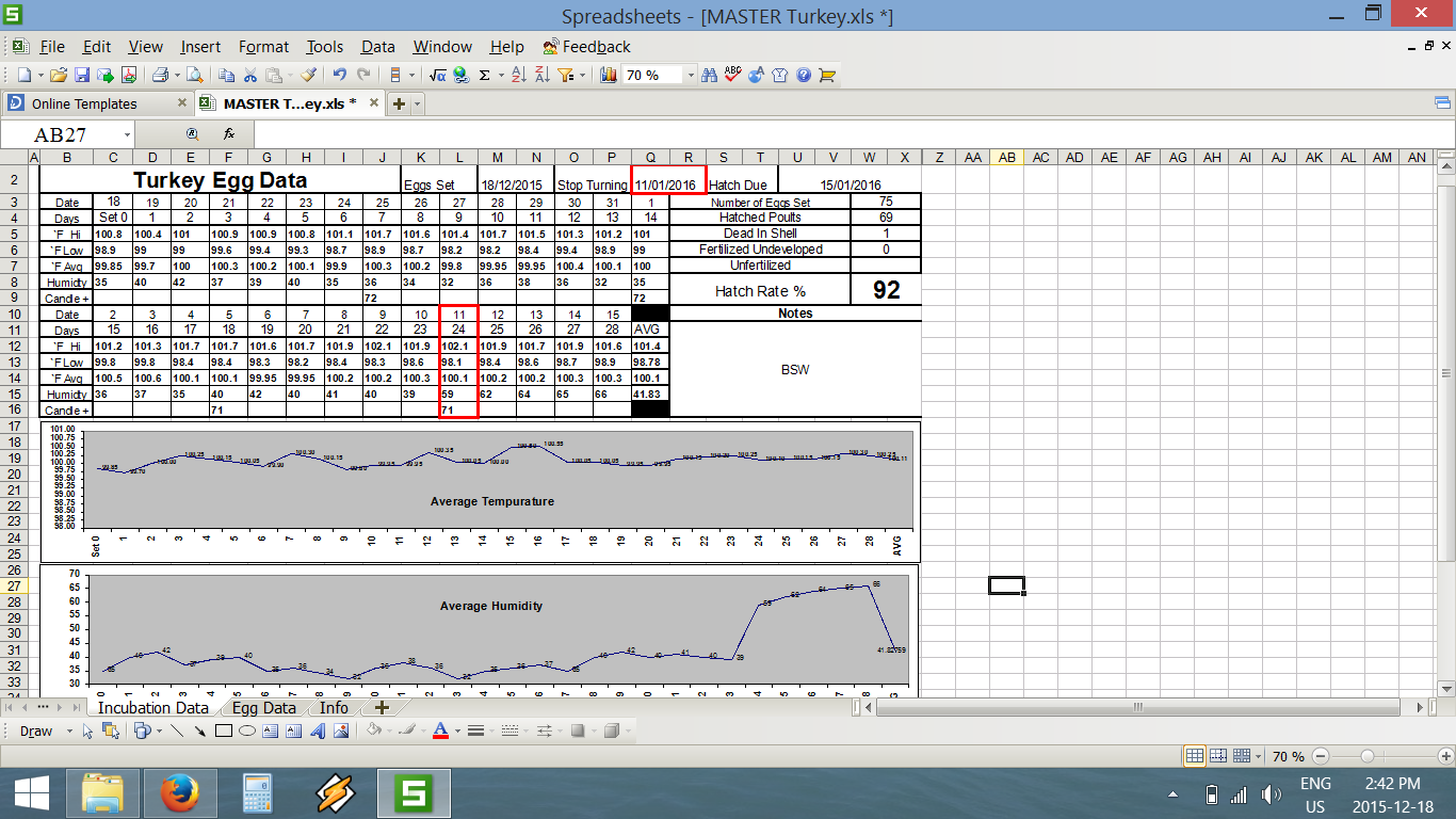 Hi everyone when I built my incubator I also built a excel spreadsheet to help me calibrate the temp and keep track of the incubation process. Then I kept adding different things until I was really happy with it, I built one for coturnix quail, chickens, ducks, call ducks and Turkeys! If anyone is handy with excel and wants to reconfigure it, it is not password protected, just turn off the protection without a p/w. Its very handy and I can look back at my previous hatches and see where I screwed up or what I did different. I couldnt believe the difference between shipped eggs and my own eggs, I was just amazed with the difference in hatch rate. I just replace "master" with the date they were set in the file name and then I can keep a record of each hatch. Now time to set eggs!