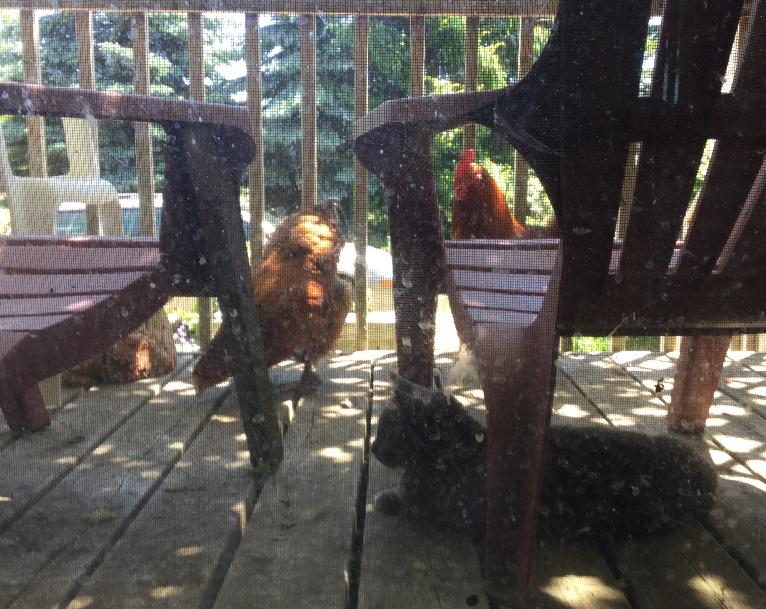 Here's Claude on the deck hanging out with a few of the chickens cleaning up the Niger seeds below the feeder.