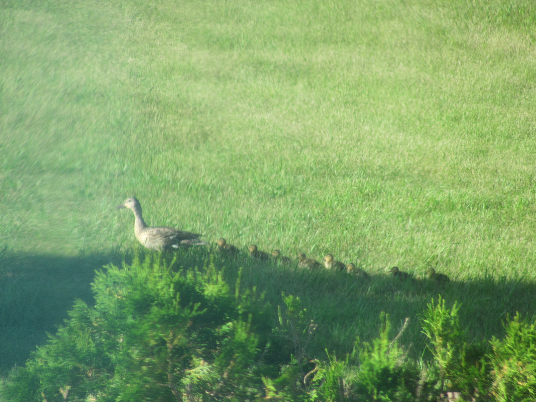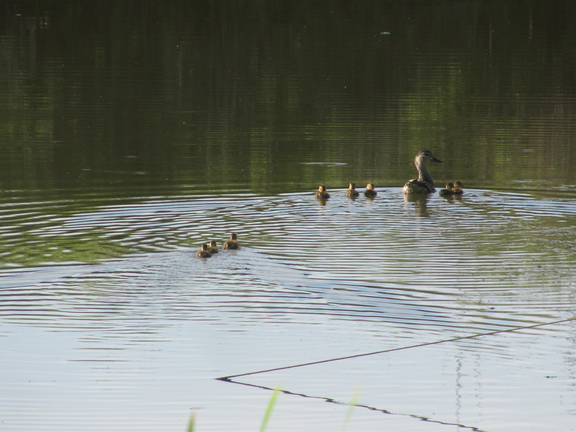 After supper, I saw this Mallard hen walk out of my pasture, across the driveway, and over to the dugout with her 8 ducklings. She must have been well hidden. The coyotes hunt in the pasture a lot, and there are several horned owls here often.