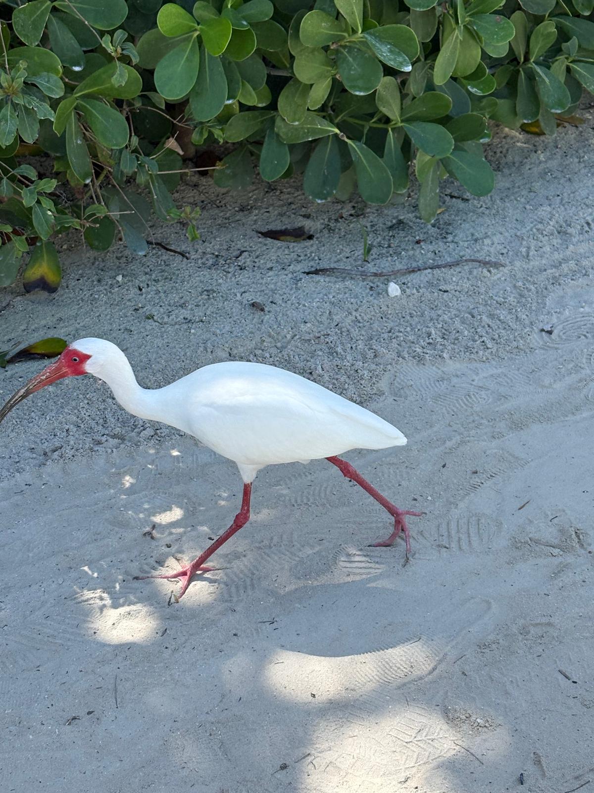 I am going for American White Ibis. Note the downcurved beak. The rooster is likely mixed breed Caribbean chicken!