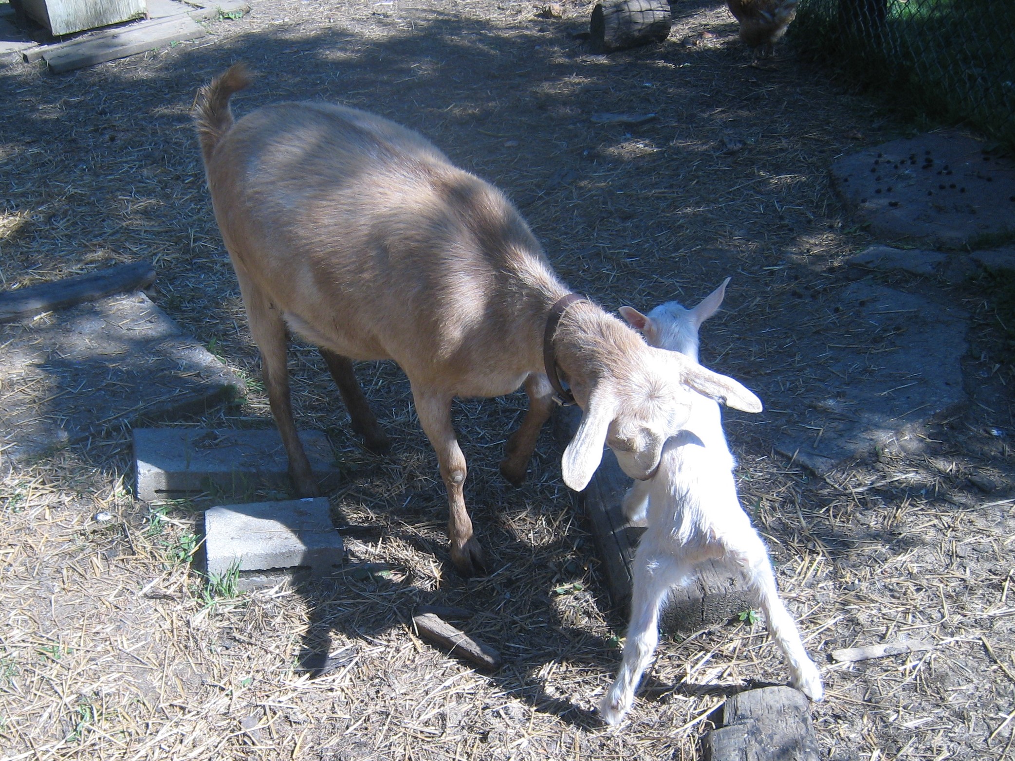 And Rhona. I decided she wasnt pregnant, couldnt find any sure sign, like kicking, and she wasnt really big. Then Sunday aft, went to feed them. Called GOATS GOATS GOATS as usual. She came ripping out of the goat house to get her grain, just like always. But she had red serum stuff hanging from behind. Went and looked in the goat house (Which is just an old oversized doghouse) and there was a baby. Another girl, licked dry and standing on wobbly legs. So all is well.