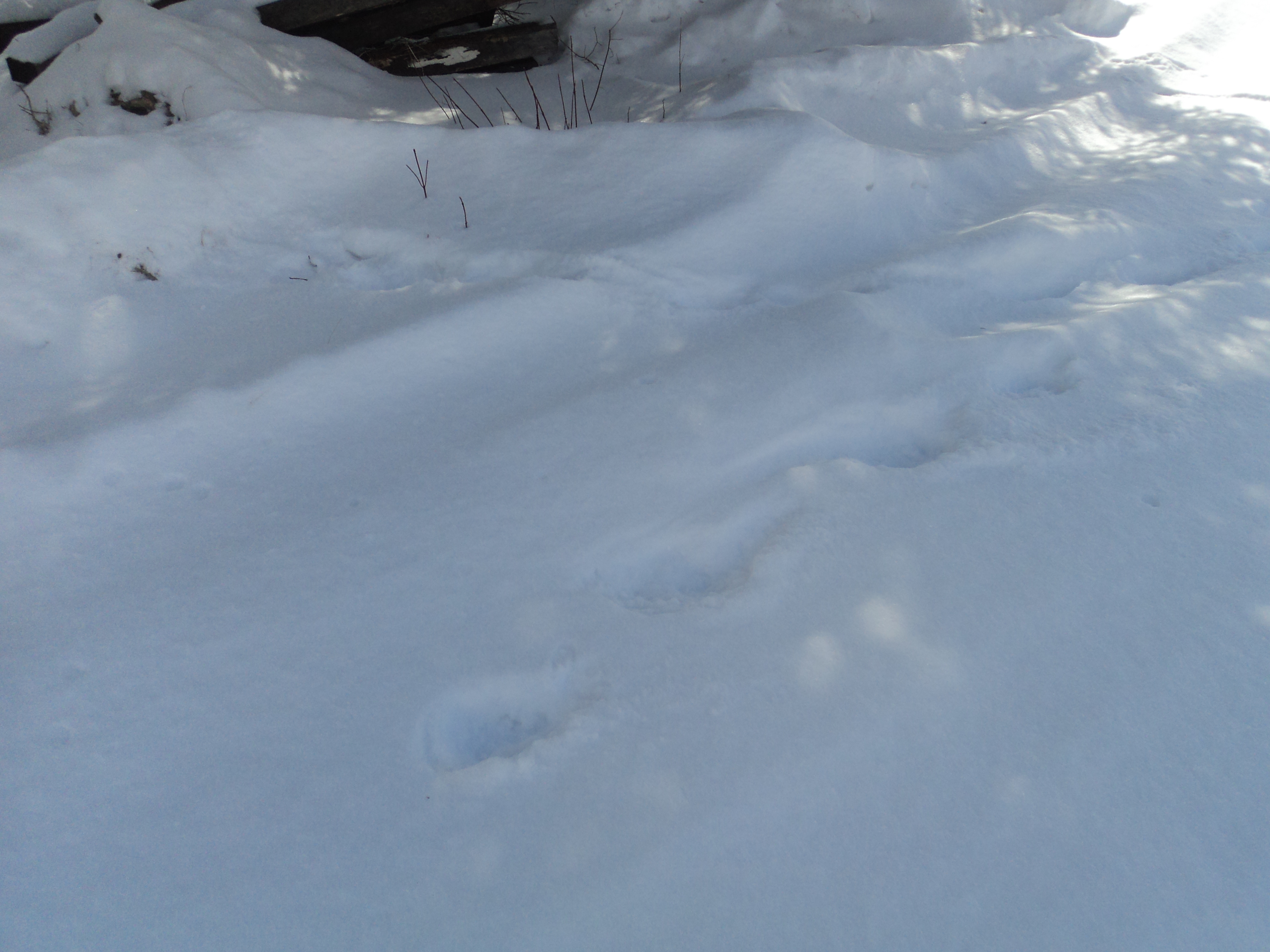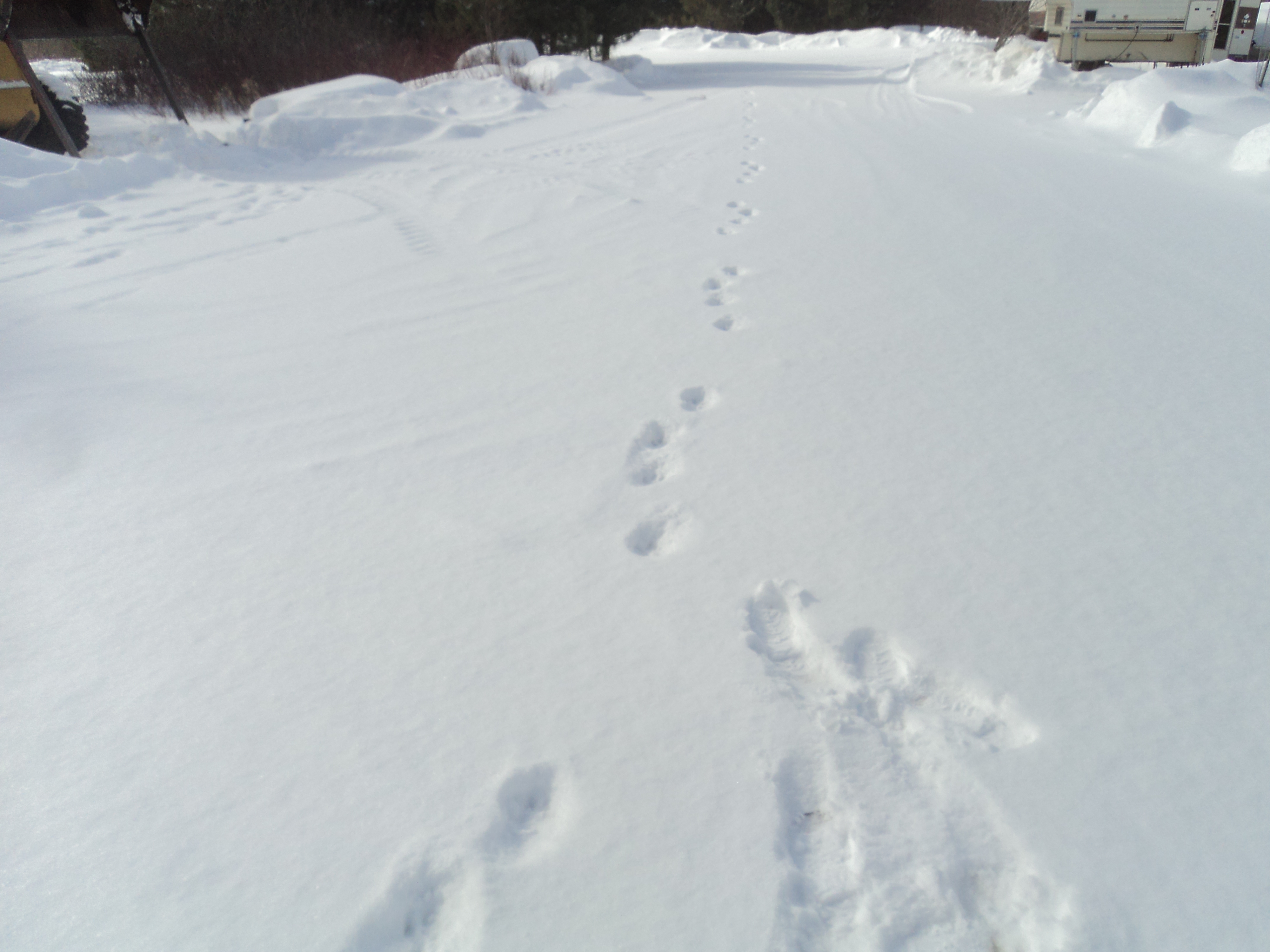 Here are some of my photos of the tracks in the fresh snow. It was the afternoon of March 8, 2015. I had let my cat out and those prints weren't there. Shortly after I'm looking out my kitchen window and see these tracks, so I went to call my cat in, but she didn't come. These tracks came right to my house. My husband found her petrified up a tree on the side of the house when he came home from work. Notice how the tracks are in a straight line compared to what dog tracks would look like.