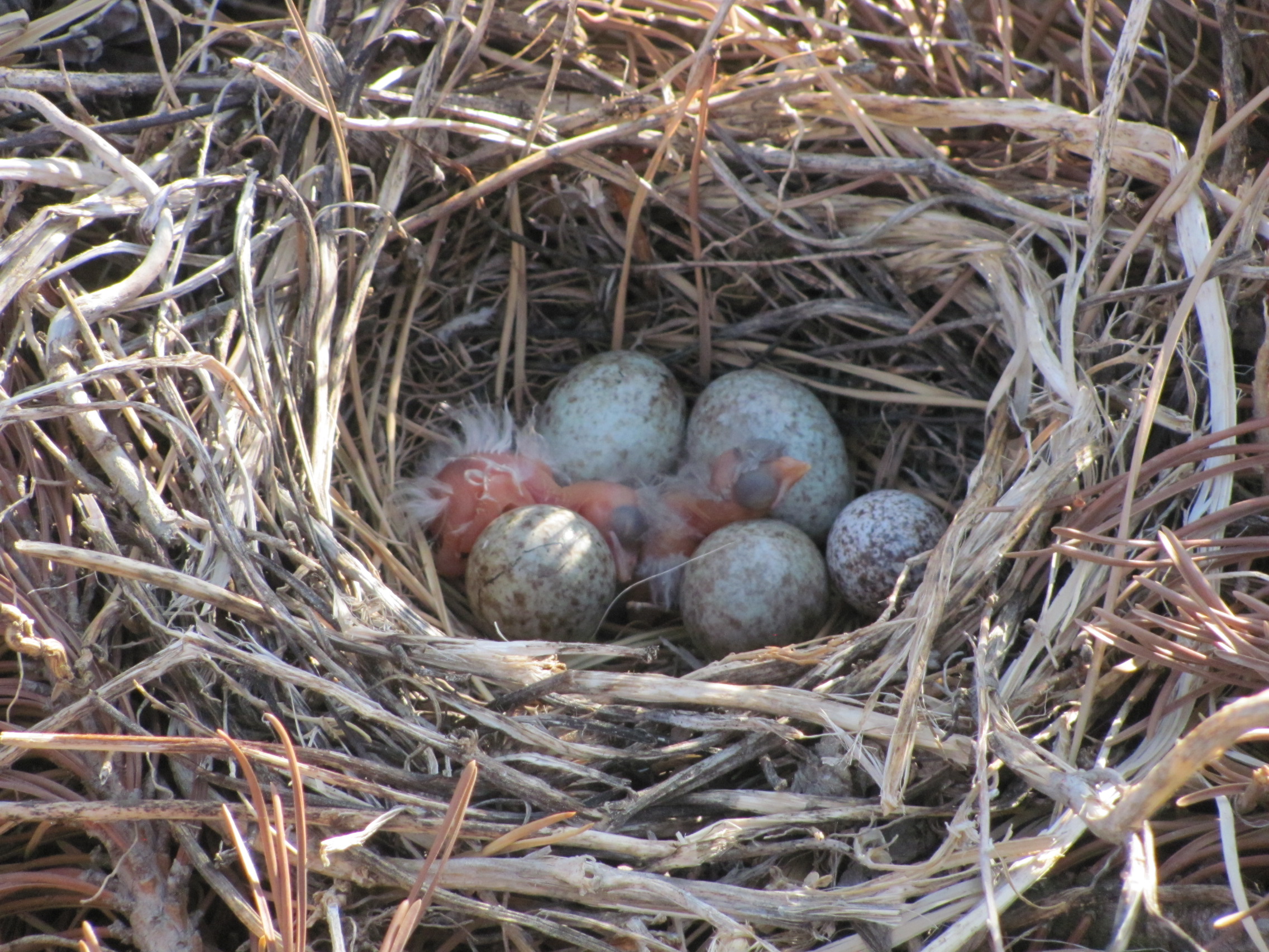 These are baby blackbirds. The nest is on a pile of pine branches that are laying on the ground.