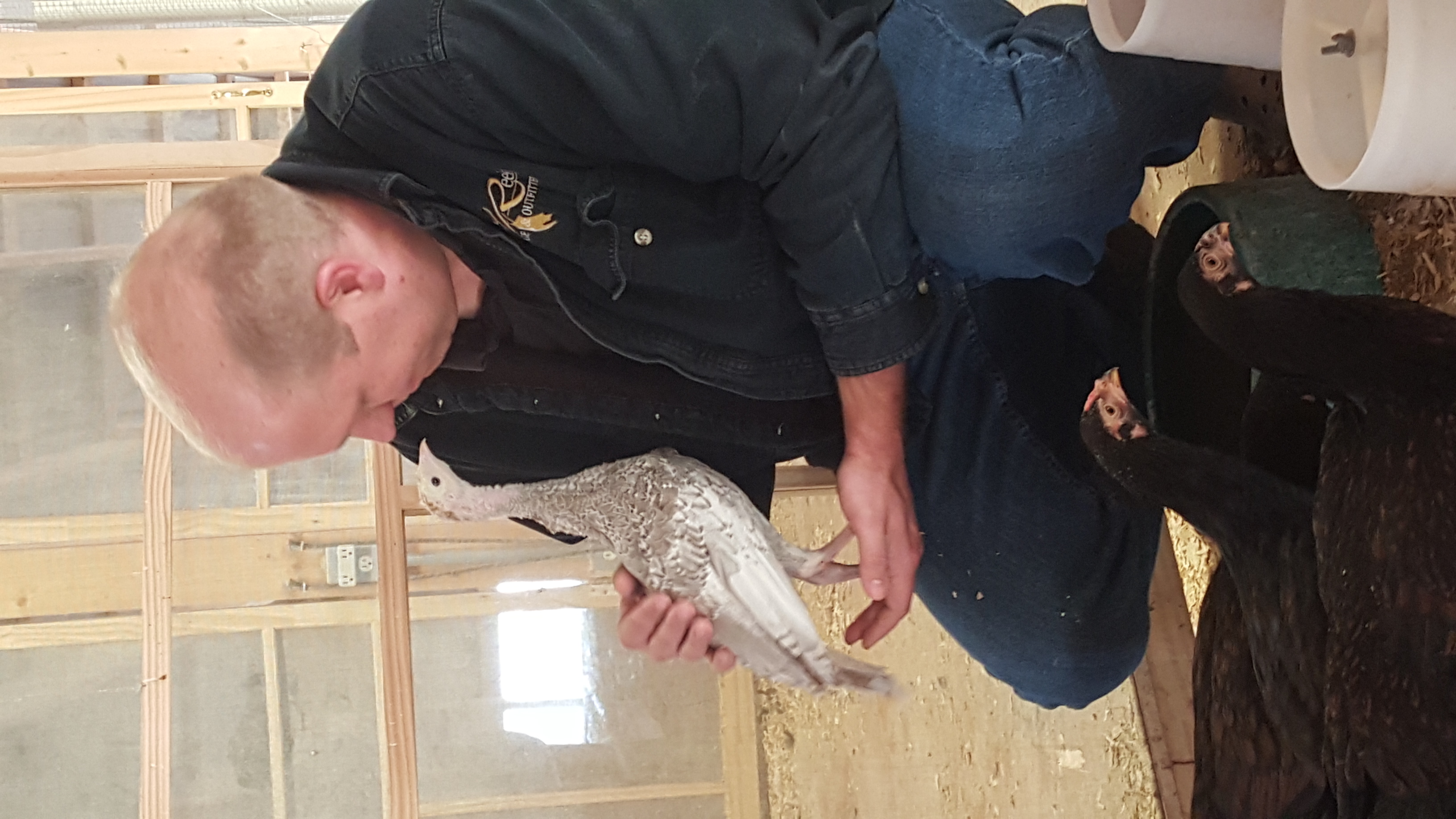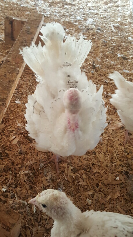 that poult sat on his hand for at least 10 minutes....truly friendly LOL. i have a bunch in this hatch that follow me around, love being picked up and will go to sleep on my arm. these are the ones that i had to teach how to eat and drink, so i think they might have imprinted on us. 4 of them come running over when we fill up water and feed. the little boy strutting (still strutting) will strut all around my feet....thinking big at 6 weeks....lol