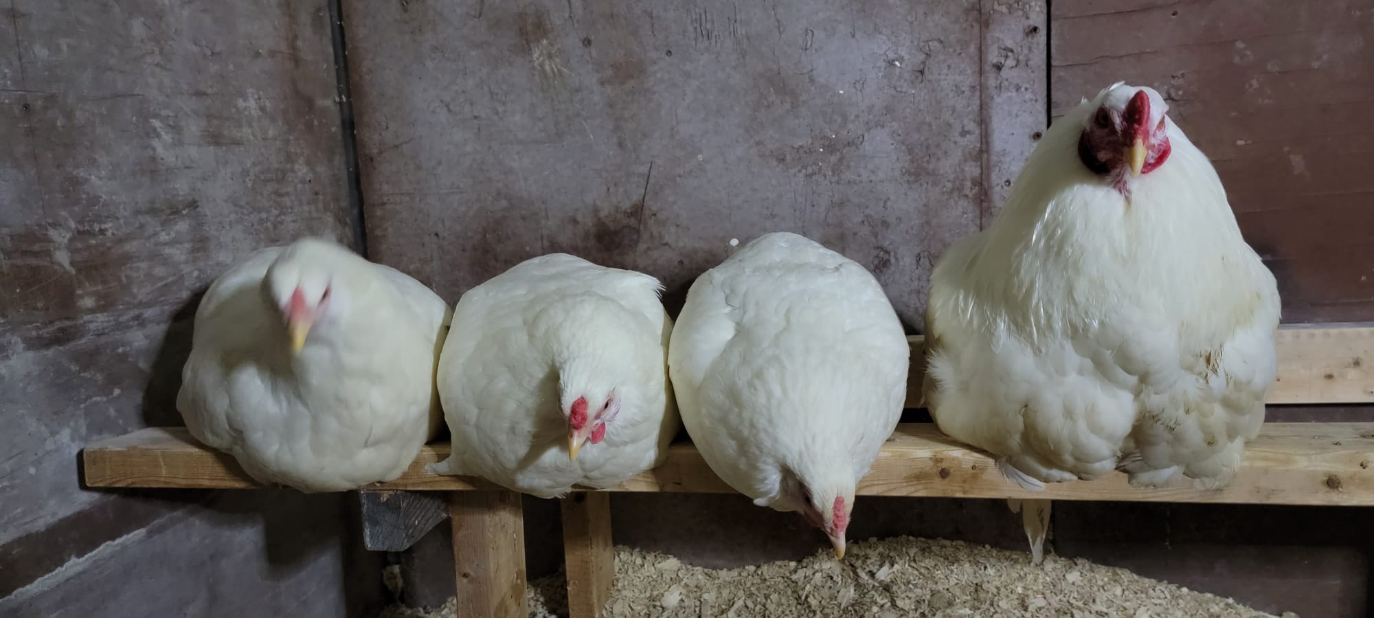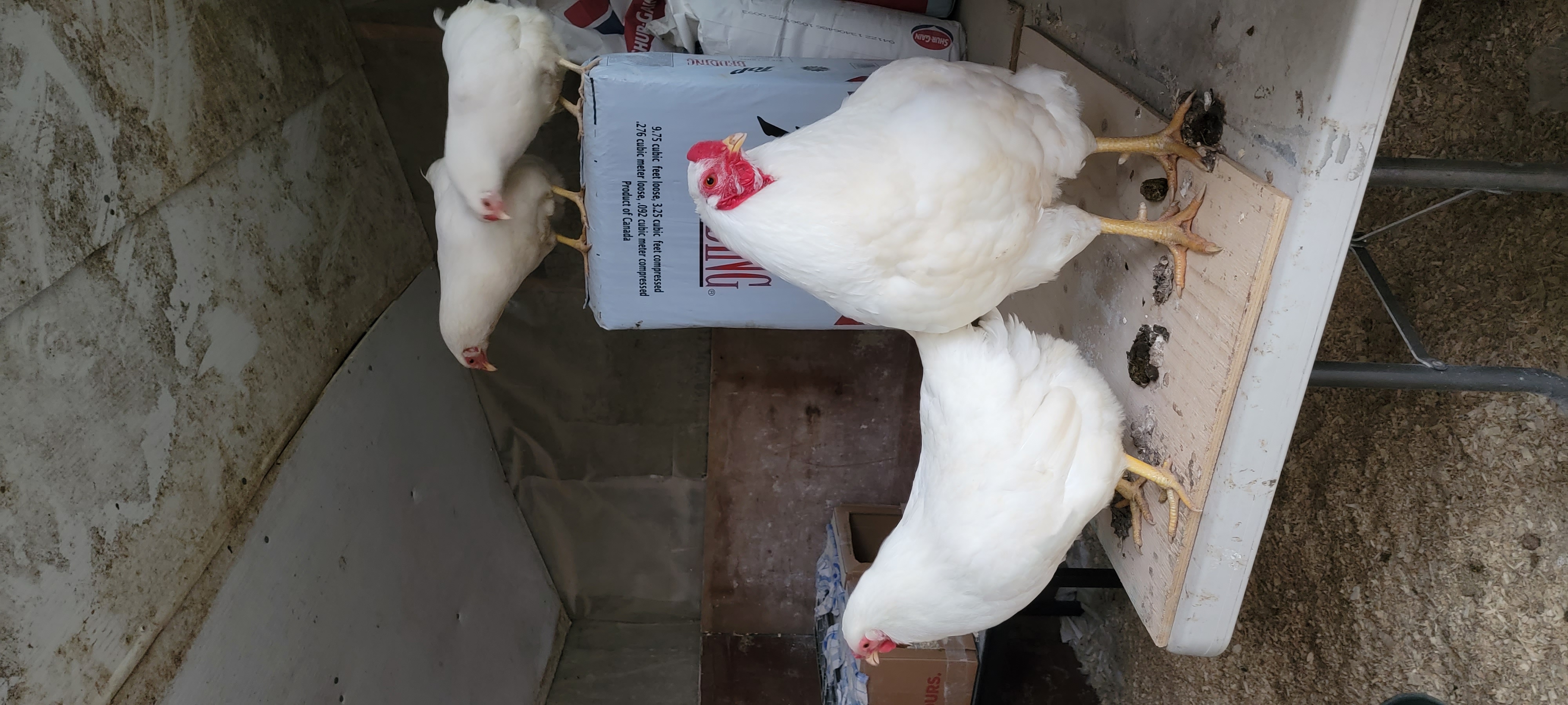 Chanteclers in the morning. Why are you pooping on my work table? One disrupter hen figured out the table was nice then another hen joined her a few days later now they all hop up there.
