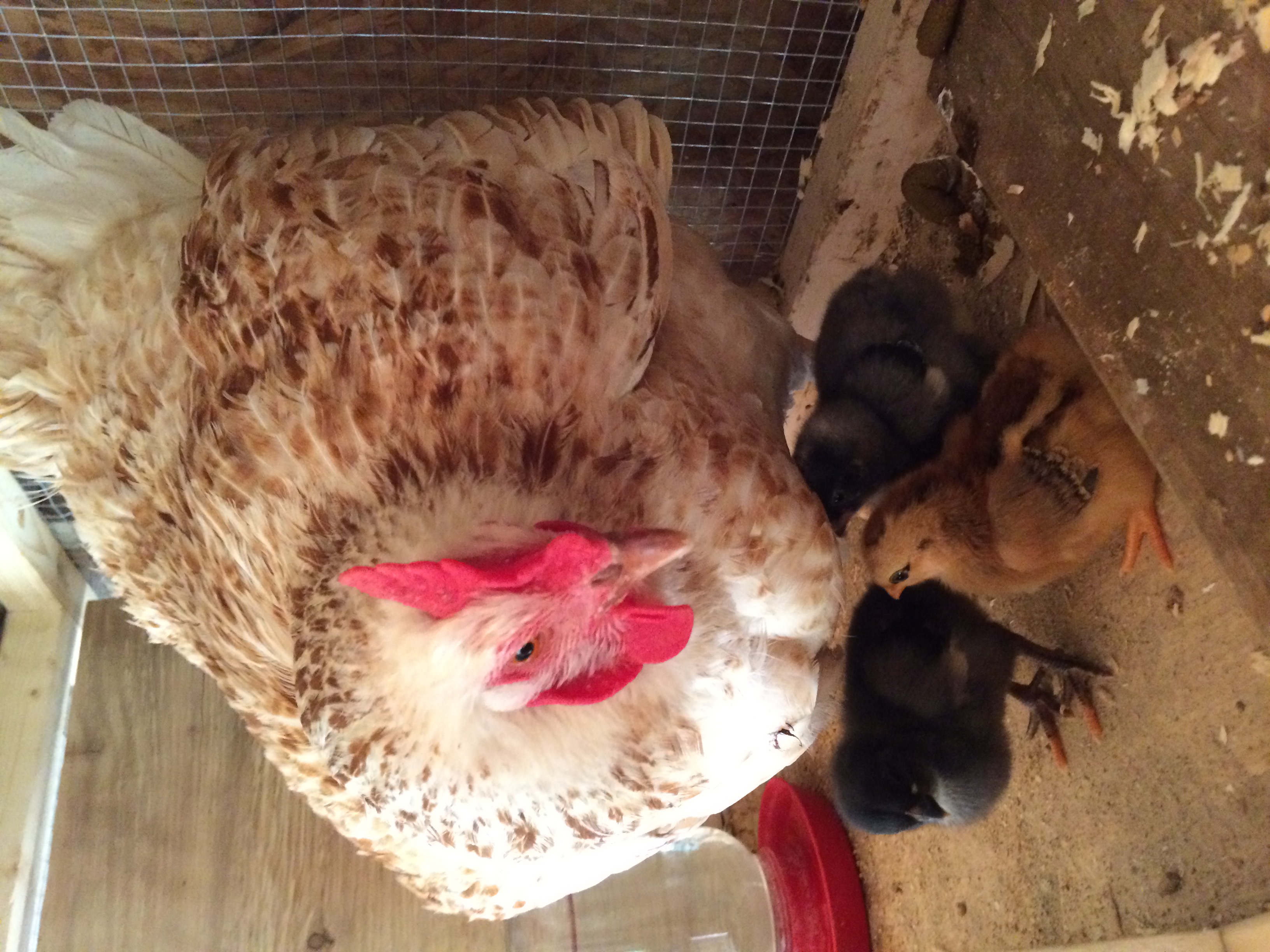 Our broody, Emily, has 5 cute chicks. She's a great mom. Would have put some of the shipped Marans chicks from this hatch under her, but none made it.