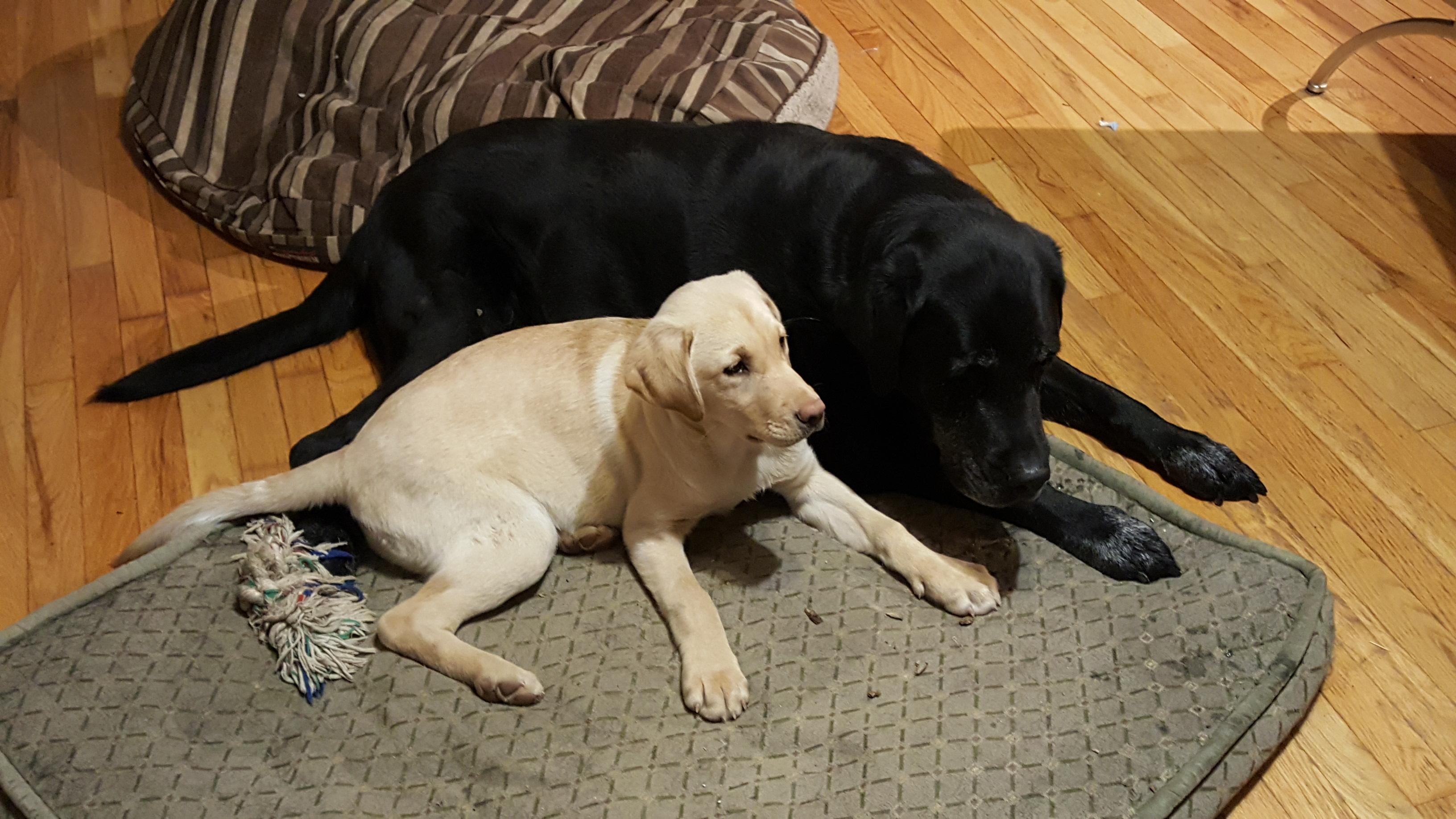last night i'm happy to report we actually slept a full 6 hours! up only once with puppy who dutifully barked at 130 that "i need out NOW" and we did. man it was cold at 130am in my PJs, hubby's muck boots (i found those first in the dark) and my big work jacket lol. only a 30 minute tantrum about being alone in the living room when we went to bed. but i do think she's fitting in quite well. sit is going well, stay will need a while longer LOL. down is also coming along, but we're starting small with sit for now. she knows that she's not allowed in the kitchen (and most of the time "out" gets her most of the way out of the kitchen). horse foot trimmings are the BEST, and i swear she's 2 inches taller this morning. she fetches (most of the time) and i think skeet is 2 years younger now. he's definitely helping to parent LOL.
