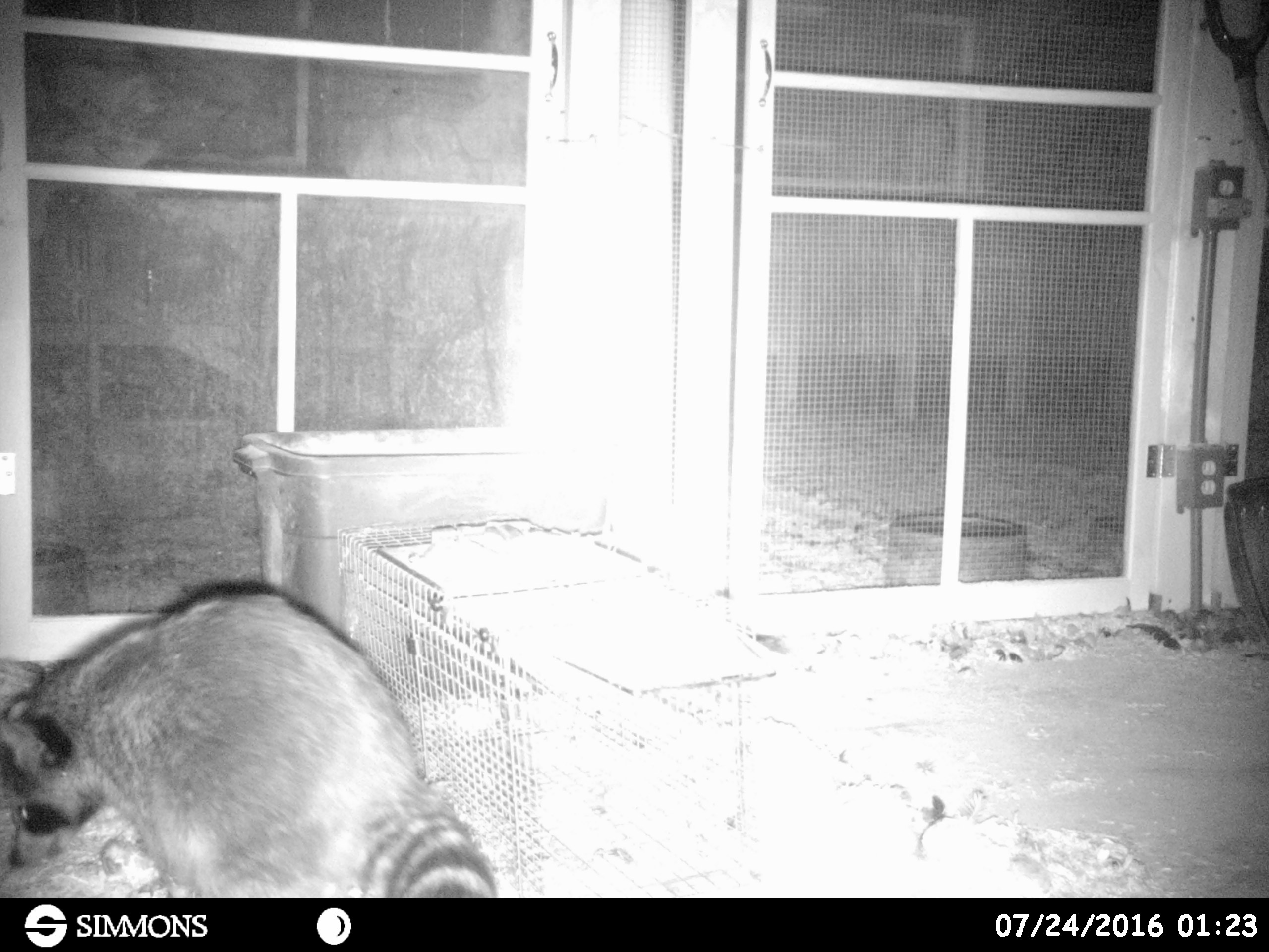 out we go and viola! the biggest fattest coon i have seen in AGES! so with hubby's help to carry it down (i couldn't lift the cage with it in it!) it is now dispatched. i had put the trail camera up last night to see if it was just one or two or what....looks like just one big old fat male. Thanks martin for carrying it down!!!! and helping set traps last night!!!!!