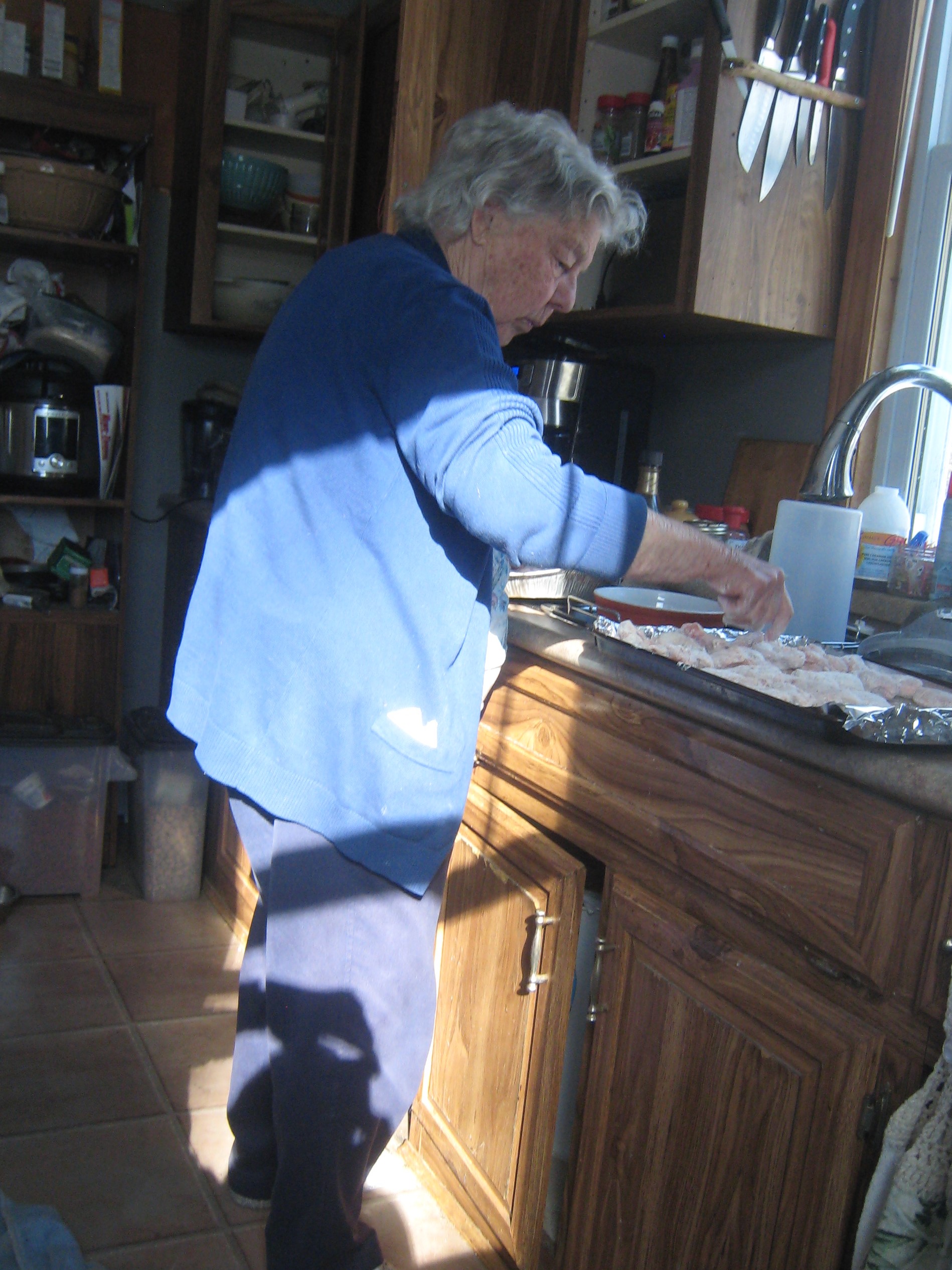 Talking about old birds, what about this 93 yr old that wants us to have a decent meal? Won't just go sit in the chair. And she was the one that found the dead rooster. No, that is not what she is cooking.