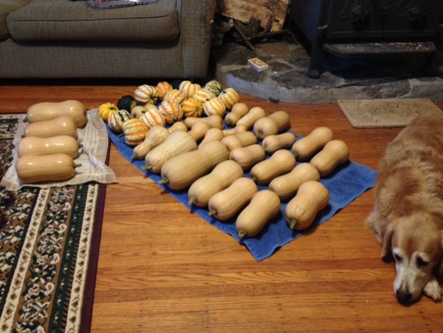 So... had another bacon on a bun for lunch.... and came home. Melissa and Scott showed up... and then we went for a golf cart ride to run the dogs... and got some more squash from the patch. Gave some to Jeremy and Melissa to take home. I've got my stash under my couch now, lol. Washed it, soaked it in bleach water for about 5 minutes, and lay them by the woodstove.