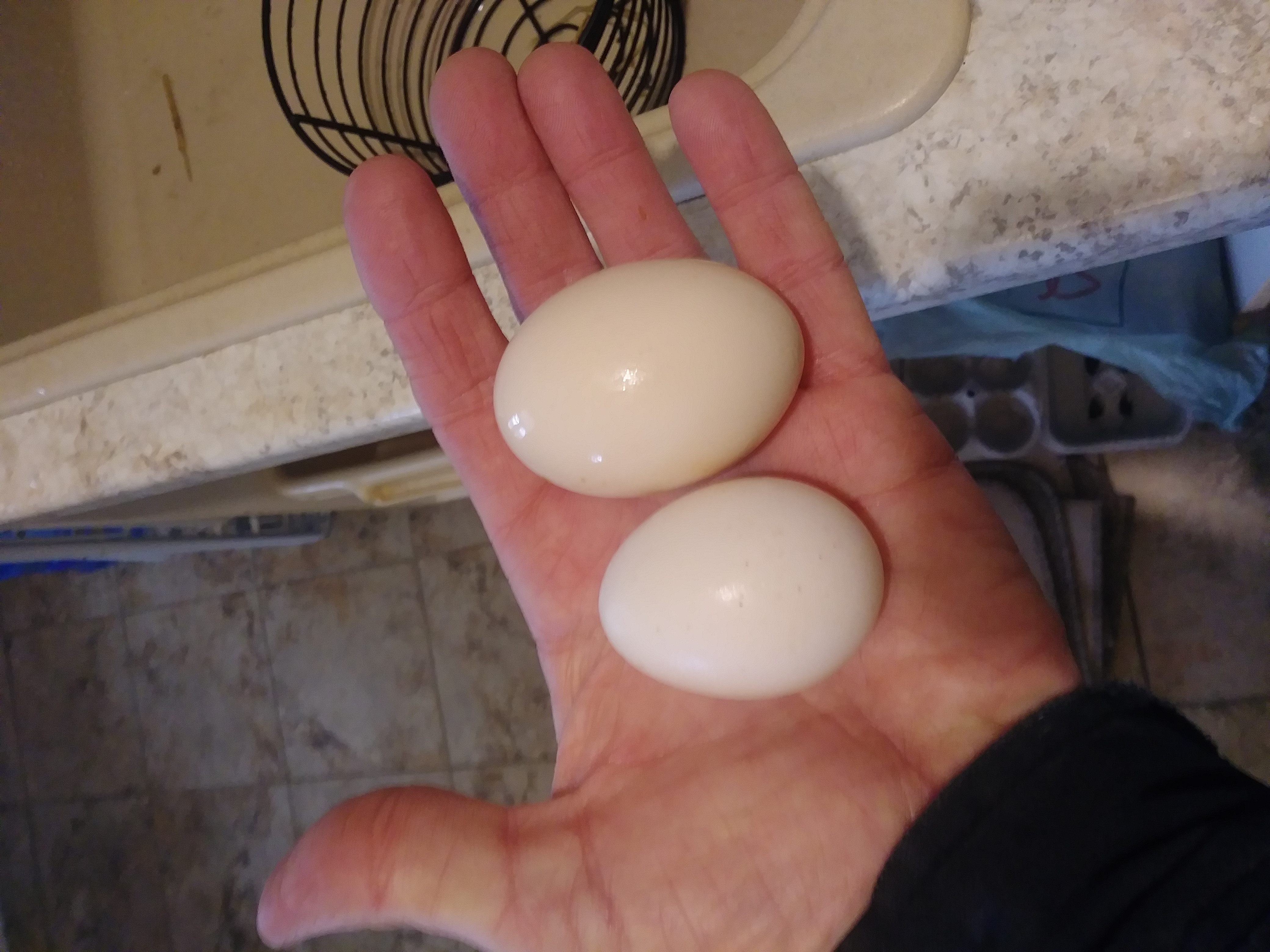Well well well...what a morning...my eldest gave birth at quarter to one last night to a healthy girl...9 lbs 10 oz...Lily....my first grandkiddo...and then (not.of the same impact but this is a poultry forum after all)..one of my two young Brabanter poults laid her first egg sometime today...nice one too..not a fairy fart but just a small size egg...on the left