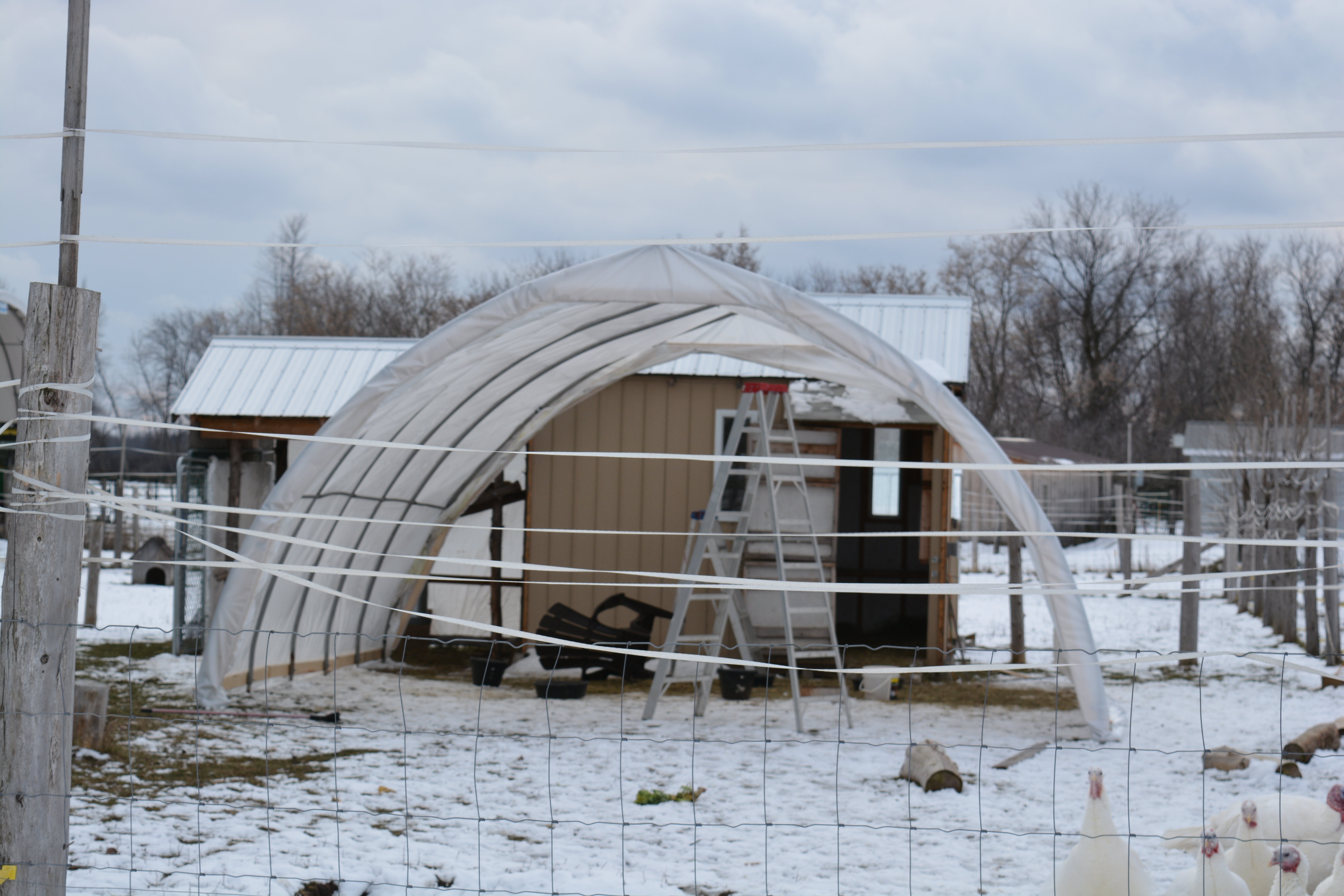 Our version of the "Winter Palace" is up despite the help of a bunch of curious turkeys and the wind which of course got up this am when it was time to put the plastic on. Vian suggested charging rent until I pointed out that they are paying with their 2 last born sons. They don't know yet!
