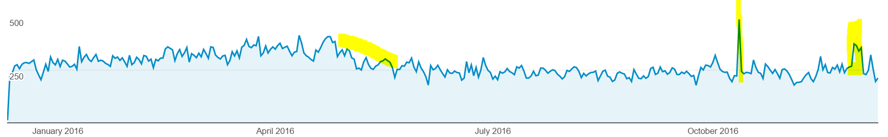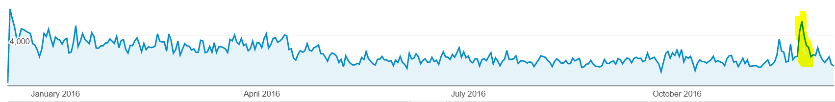 99,500 sessions (first yellow area is when the weather got nicer people spend more time with the chickens; spike was a company in the US trying to "sell" their product; bump at the end is our online show