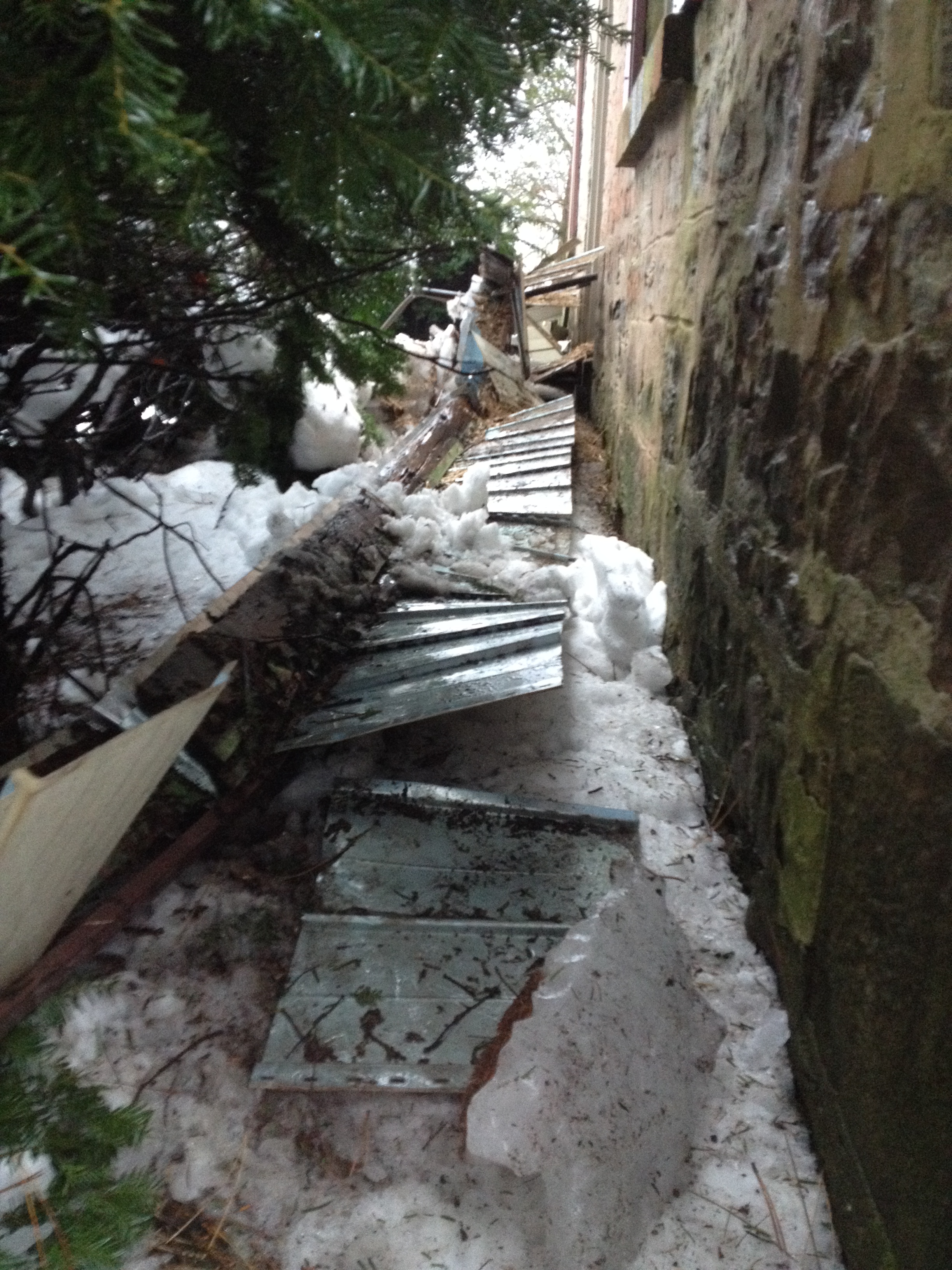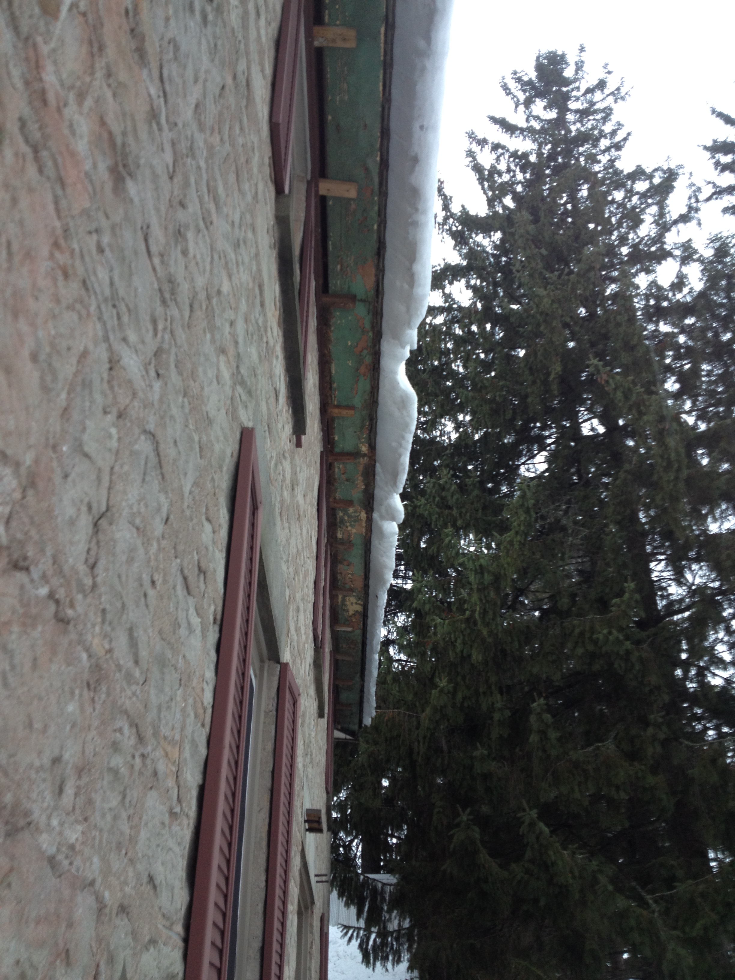 So yay. Everything came down. The back of the house.. which is the door we use all the time, is much the same. Snow/ice load in the eavestrough, and sliding heavy wet snow will pull it down also. Course, the spot sagging is right where the hydro comes in to the house.
