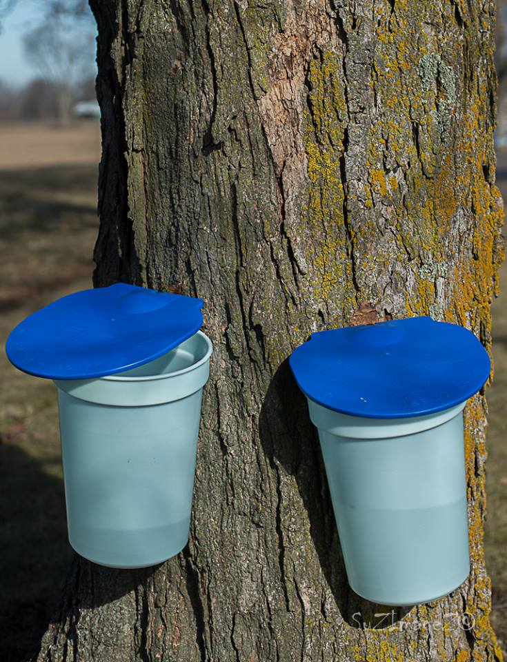 Here are a couple of 'friends' pictures (cough/hack/choke).. only Sandy will get that..... of a couple taps on a tree in the lane. I haven't taken any yet. She wants to come back Wed. when we will have more sap to boil. Think I will go shopping that day.