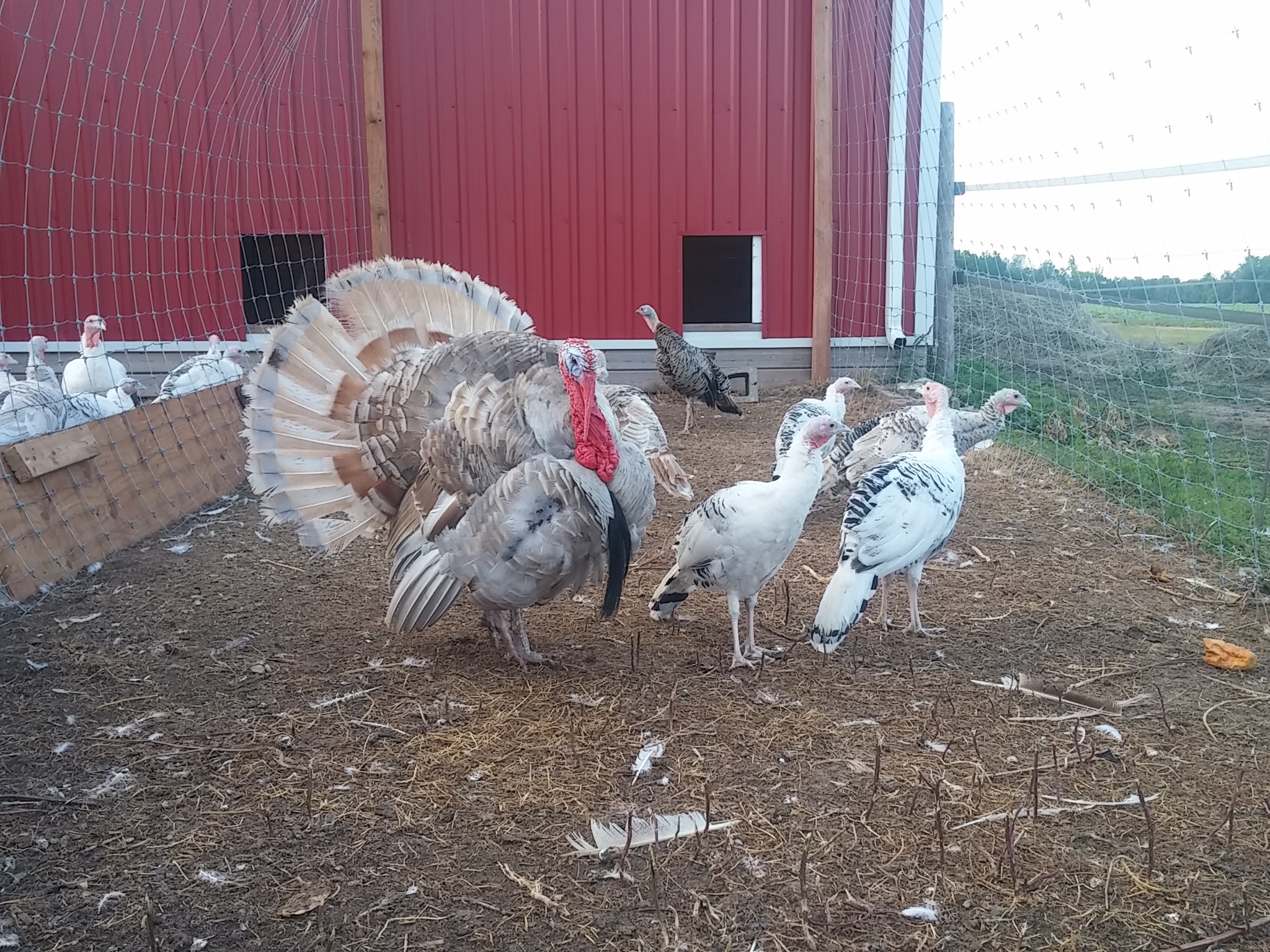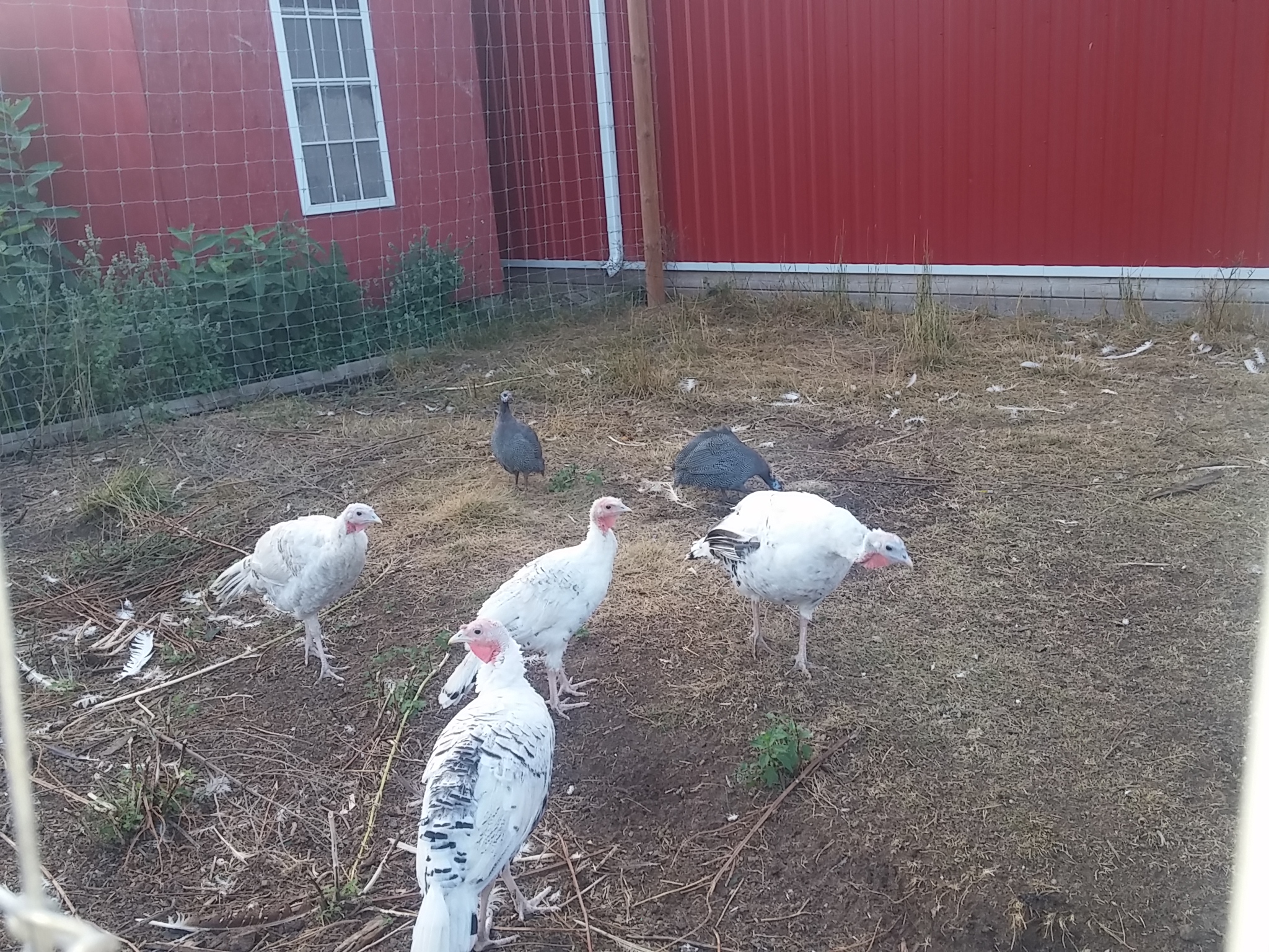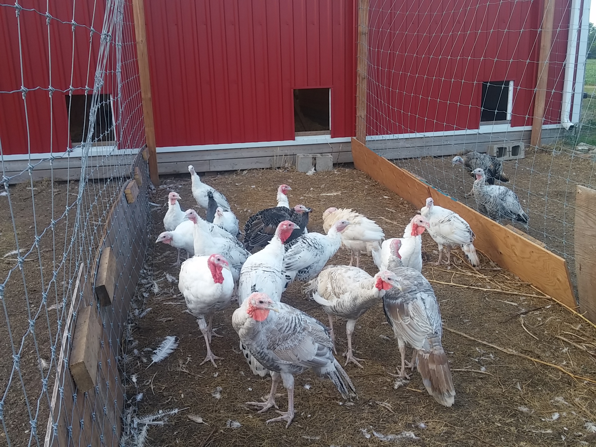Kind of a busy day today I think I have more raccoons terrorizing the birds, one young pullet dead through the mesh of 1 of my hoop houses and my young turkeys in another hoop house must have got spooked or something and some how 1 strap came off the door and most of them were out this morning, missing 2 of my 16 young beltsville, caught the rest. Fixed hoop house hopefully all will be good as I am leaving for 3 day road trip back to London with my daughters.
