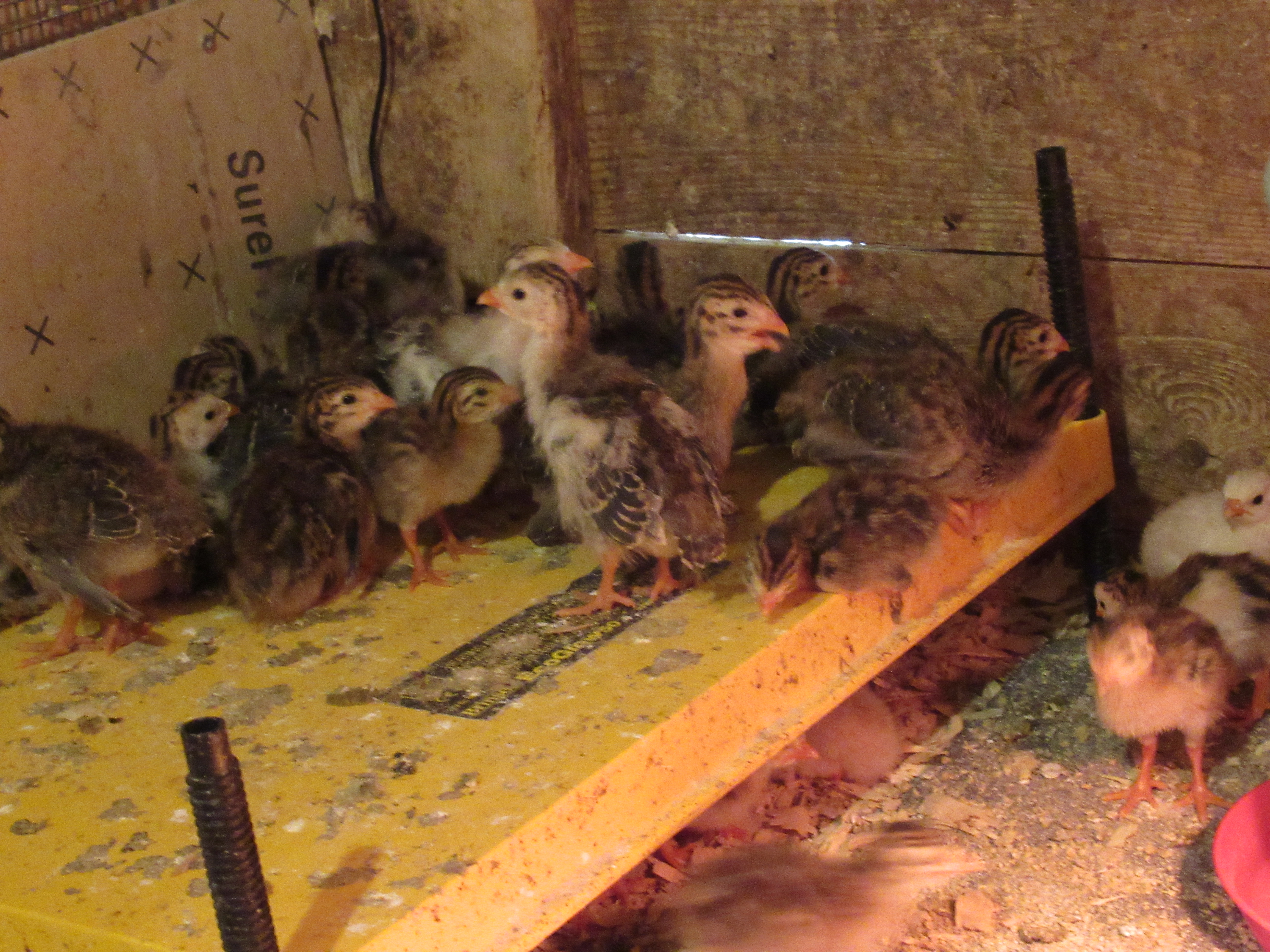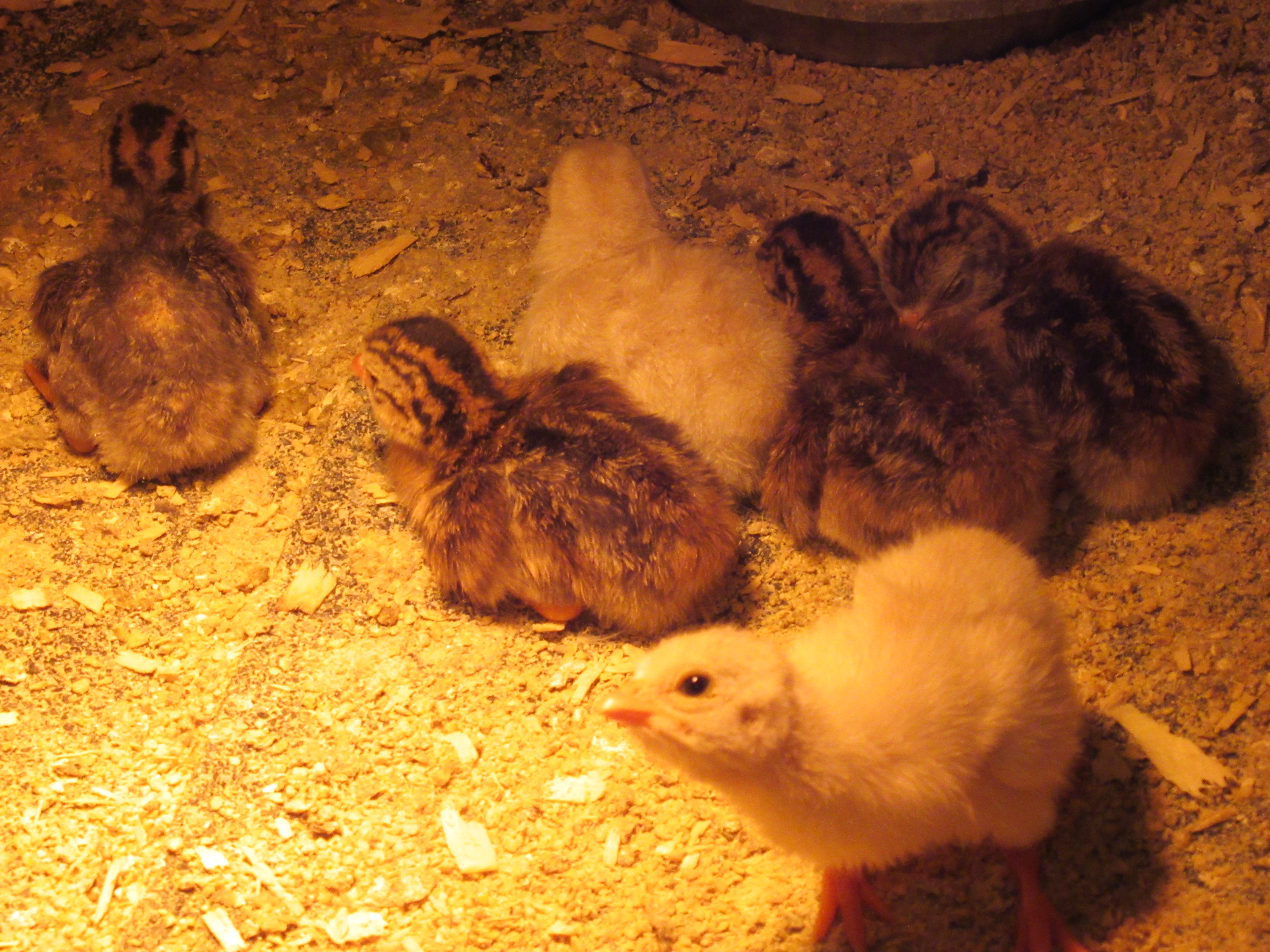 Heres the whole group of mixed up pullets. Some are EE's... and there are 3 BCM in there, but I have NO idea whether they are cockerels or pullets. They all look the same to me. The one is on the cement block on the right. They are all in the picture tho....