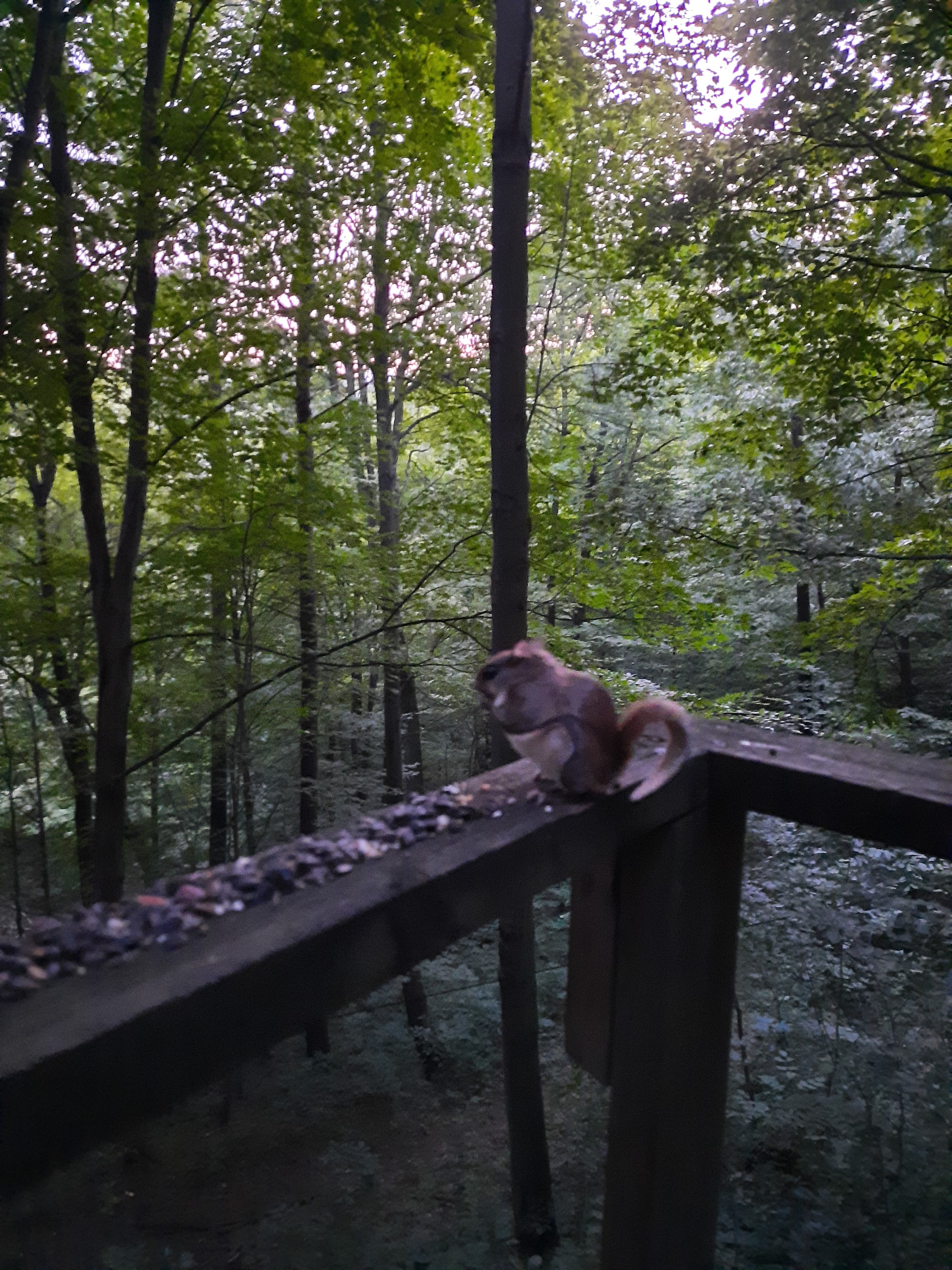Fresh crop of flying squirrels at the cabin. This one you could reach out and grab. completely unfazed by the fact I was sitting right next to it.... and I had my drink on the railing also.