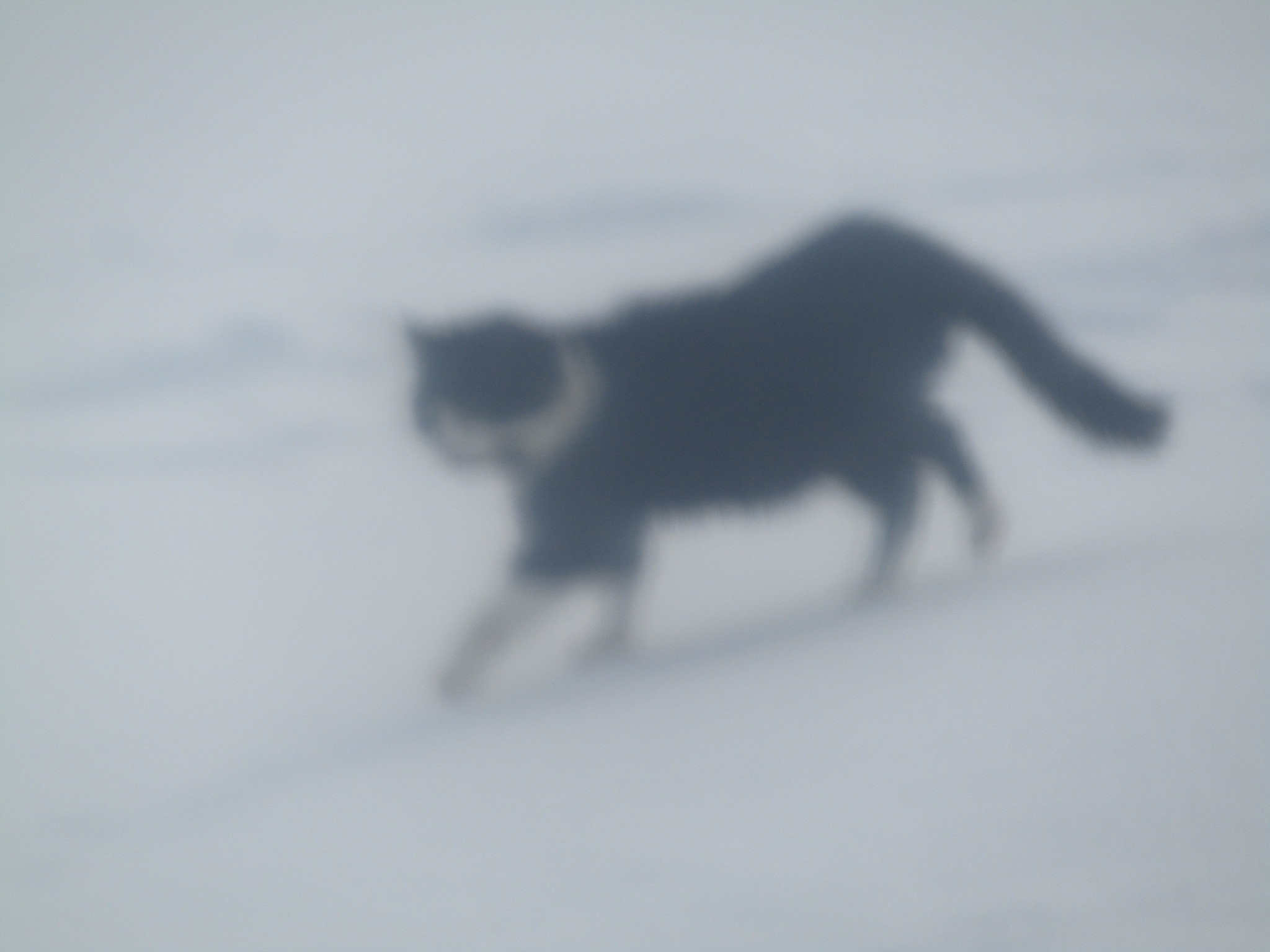 Your Muppet is a very pretty cat. I tried to get a picture of the one here. It's black and white with yellow eyes. The coat is kind of medium length. It moved so the picture is blurred. I still think it is not a year old yet. It caught a partridge yesterday and ate it in the kennel. Nice mess. No wonder it didn't eat the cat food I put out.