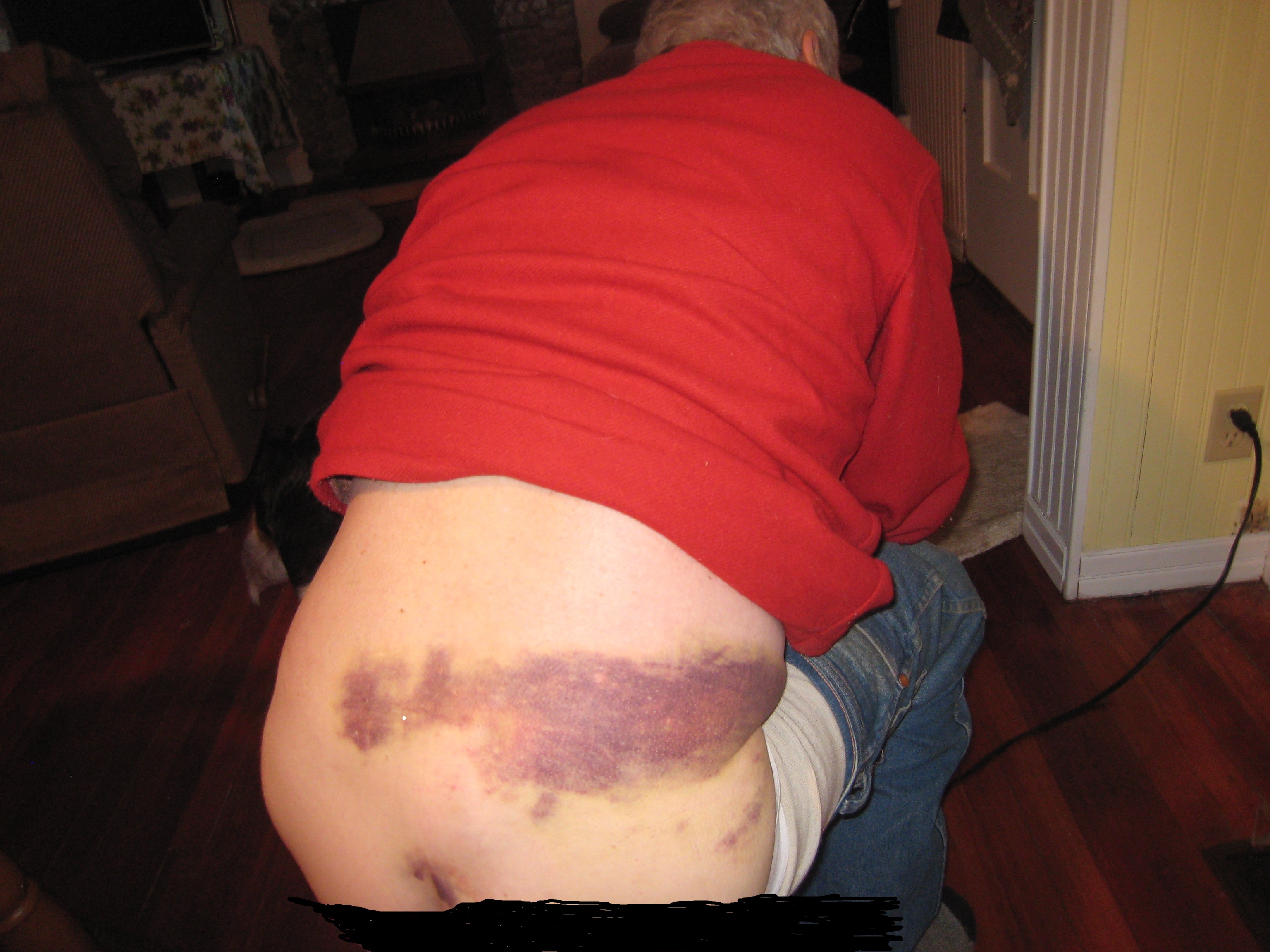 The goddess spouse RN wanted me to go to emerge. I told her that was for sissies and sat in the lazy boy for a few hours with the heat on. Got up and undid my belt and about a half a volleyball kind of rose from just behind my right hip. I learned a new word. Hematoma. I decided maybe I was a sissy and we went to emerg. Nothing broken, as I had self assessed, soft tissue injury, will be sore for a while, but no lasting effects, no internal bleeding.