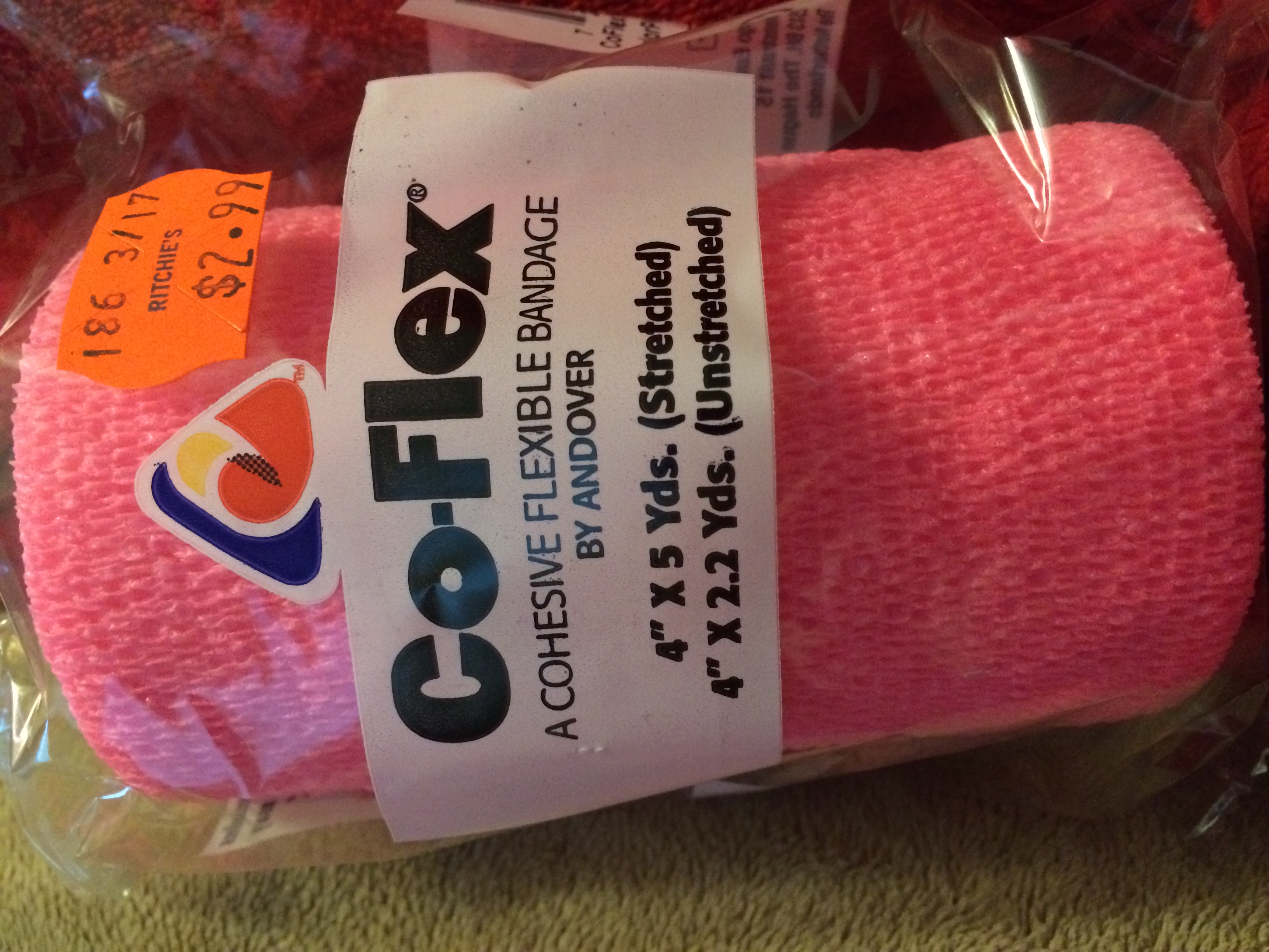 Just grabbed this yesterday. This is used on horses legs. I cut it in half. I find this easier to get off than tape which has to be cut and isnt flexible so I always have a roll or two on hand.