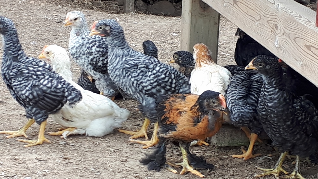 Thought I should post a photo of my chicks! Although they are now 5 weeks old. I had never kept track of how long it takes chicks to get used to going into the coop at night, but these little guys were all in the coop the fifth night; so, it only took 4 nights of training. The Barred Rocks are obvious with no feathers on their feet (just what I wanted), not like the black and tan chick in the forefront with mega feathers on his feet.