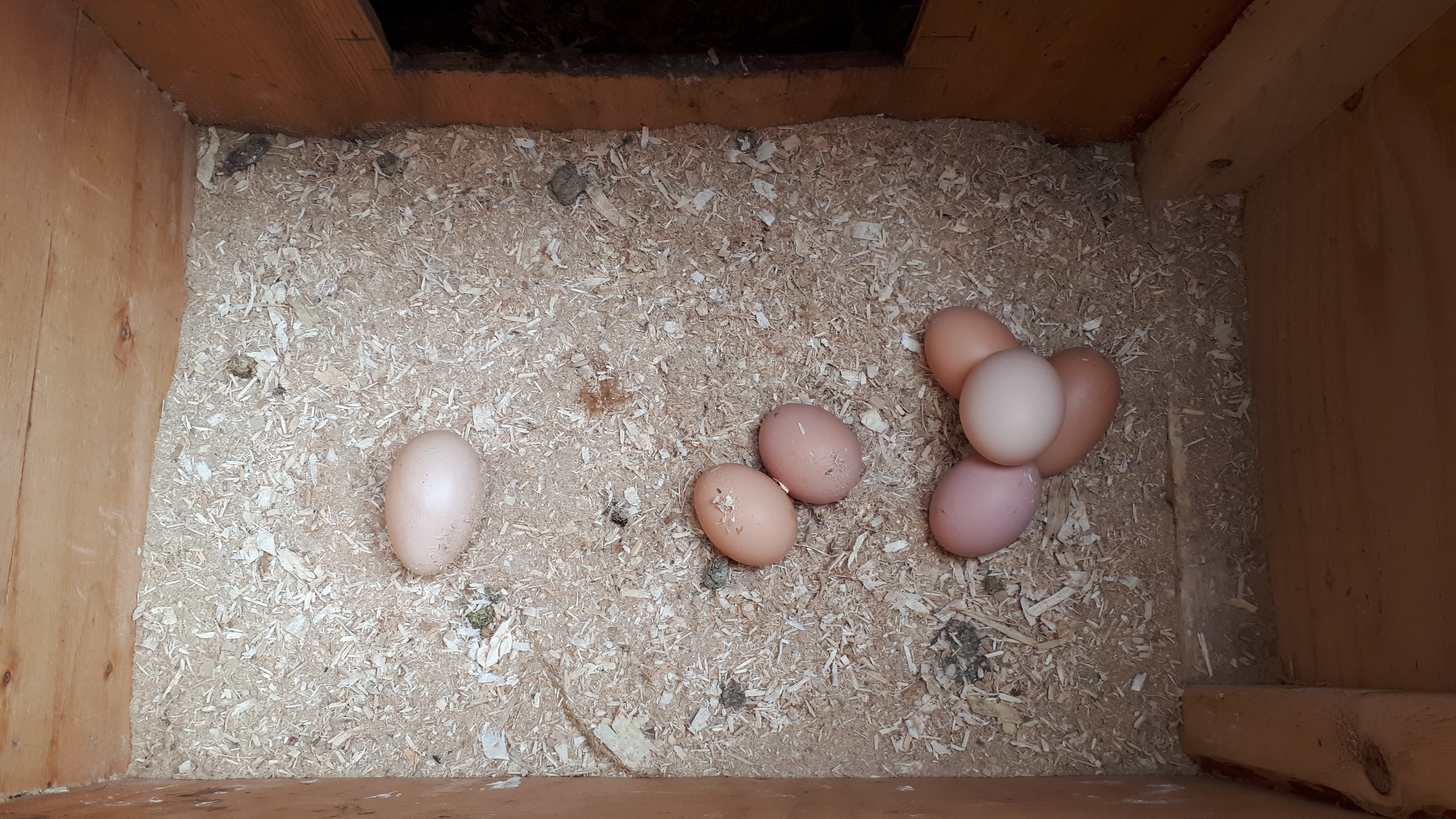 So... when collecting eggs again today, I'm wondering what the heck those dark spots are in the photo. There was no poop in either laying box. I guess it's just one of the wonders of technology and lighting. I checked and stirred and double checked. Nothin'. And that's the way, uh huh, uh huh, I like it, uh huh, uh huh.