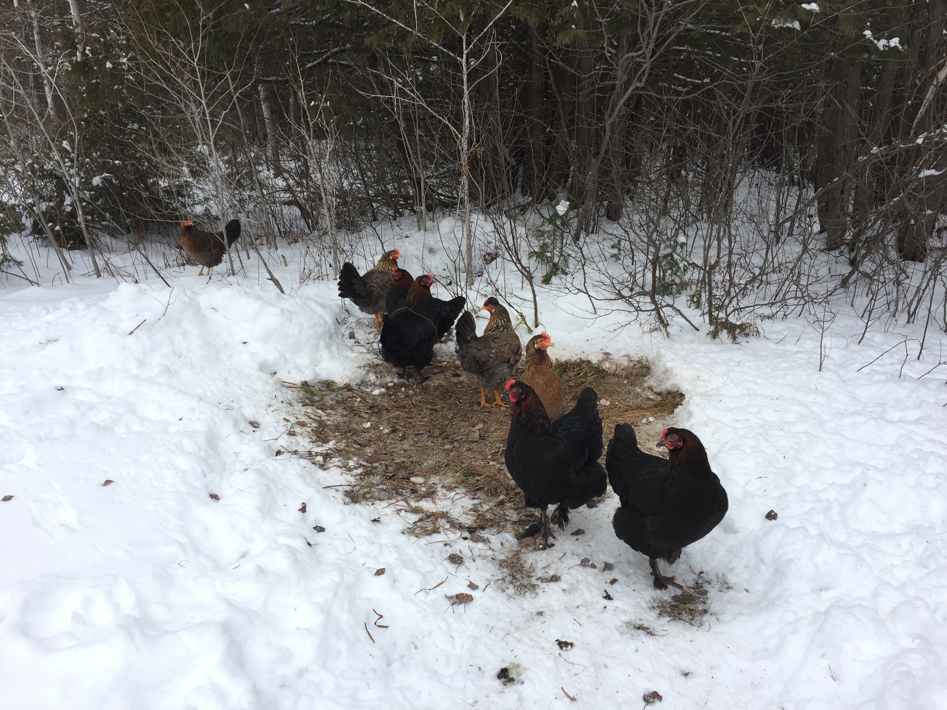 I went back inside, got my gun and the dog on a leash, and headed back out to search the woods. This was the day before it snowed so there were no tracks I could follow, and we found nothing except a rather large clump of feathers (but no blood) from one of our cream legbars, so assumed at that point at least one of them had been taken.